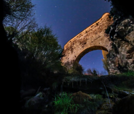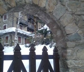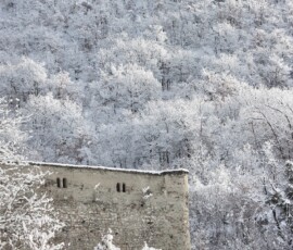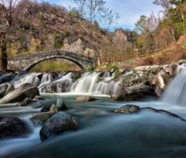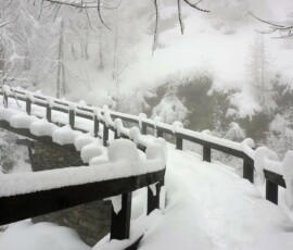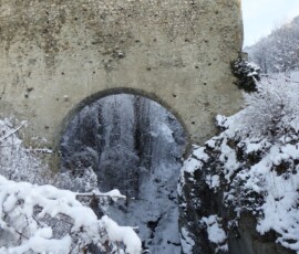15 - Carta Andrea - 45.763204 N, 6.987293 E. L’imponenza del ponte e la costruzione in pietra appoggiata alla roccia, raffigurano un quadro dipinto in un’altra epoca. L’effetto viene evidenziato dal torrente, dalle tenui tinte di verde, tortora e dai numerosi fiocchi di neve