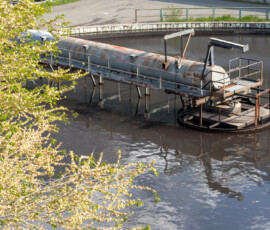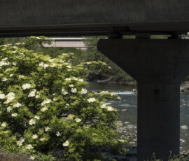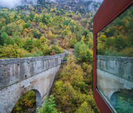 117 - Domaine Martina - Lo scatto cattura un istante in cui il treno, il ponte e l'acqua della centrale sono sospesi. Le opere ingegneristiche si incastrano nel paesaggio primaverile richiamato dalla fioritura del lillà.