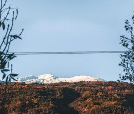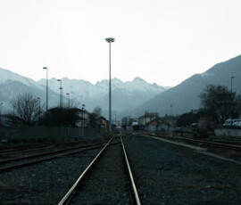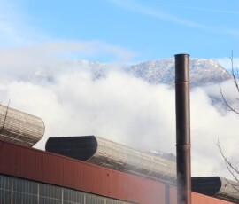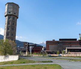 123 - Carta Andrea - Fredda primavera - Saint Denis - Le cime ancora innevate e il cielo parzialmente coperto ritraggono una primavera tardiva, fredda quanto il particolare di una struttura in acciaio.