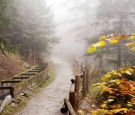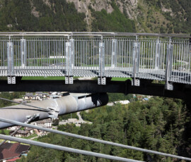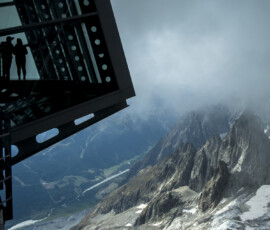 16 - Carta Andrea - 45.765974 N, 6.980951 E. La passerella sospesa sovrastata dalle nubi sembra un essere alieno surreale. Il pannello e la parete rocciosa sul versante opposto, al di fuori delle nubi, danno profondità di campo e riportano l’intera struttura alla realtà
