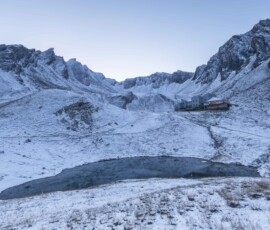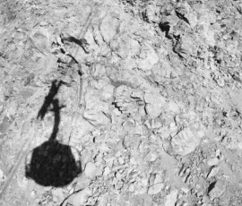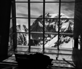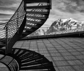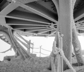 14 - Carta Andrea - 45.765974 N, 6.980951 E. La neve che tutto copre non sembra avere il sopravvento sulla struttura sospesa. Al contrario le linee di forza di tiranti e travi vengono enfatizzate dalla neve e dal contrasto bianco/nero della foto