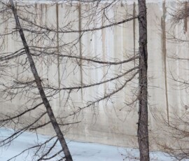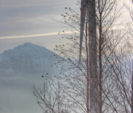 13 - Carta Andrea - 45.765974 N, 6.980951 E. La foto richiama l'apertura di una finestra su un paesaggio invernale. Le linee orizzontali e oblique si intrecciano con armonia. Lo sfondo con gli alberi ritti sulla roccia da forza al contesto ambientale