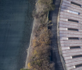 30 - Sasdelli Luigi - Aosta-Saumont: da destra, la vecchia centrale, dismessa e restaurata, con il canale sopraelevato di alimentazione; il viadotto che collega l'autostrada a Via G. San bernardo, il nuovo tratto di strada per il Poligono.