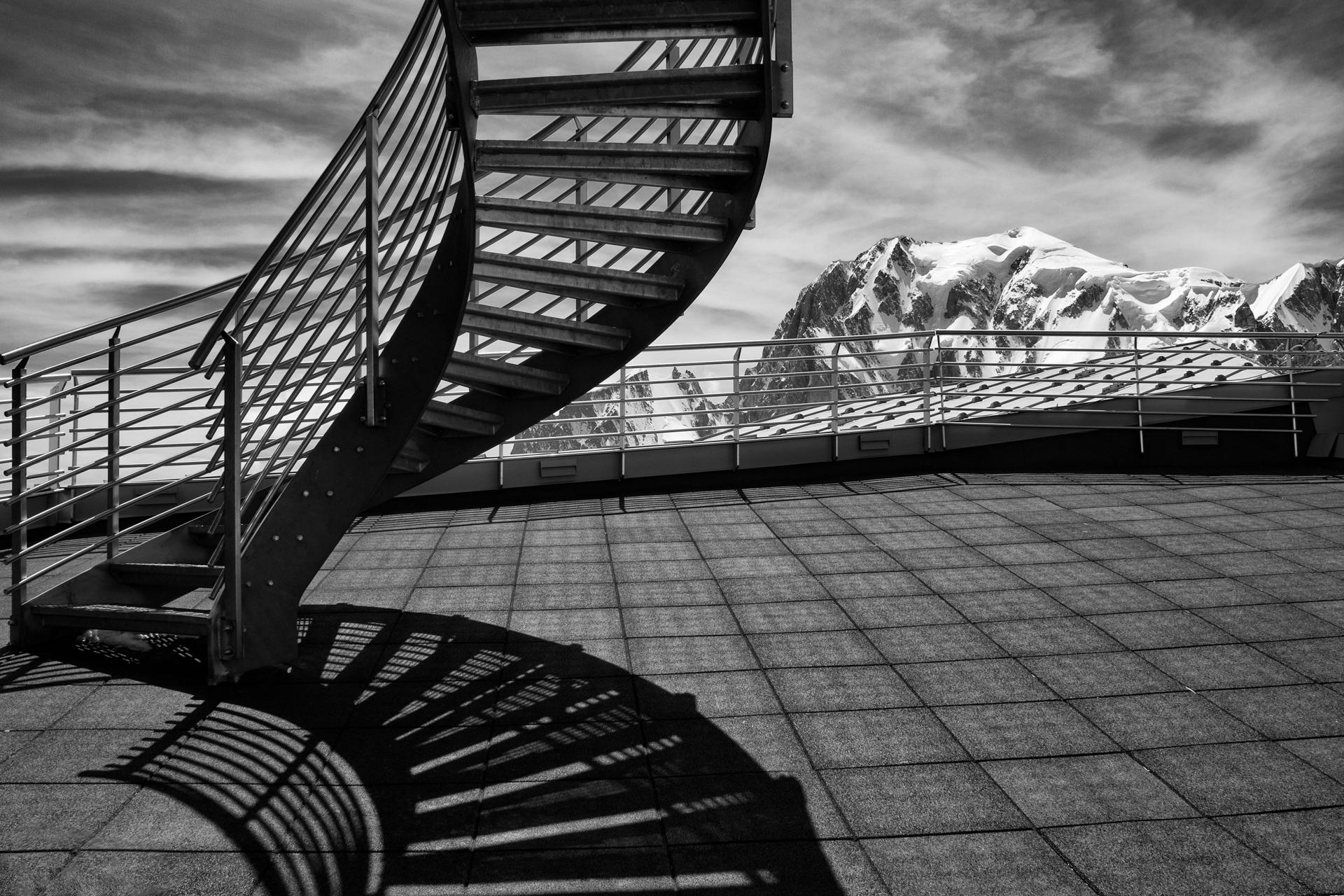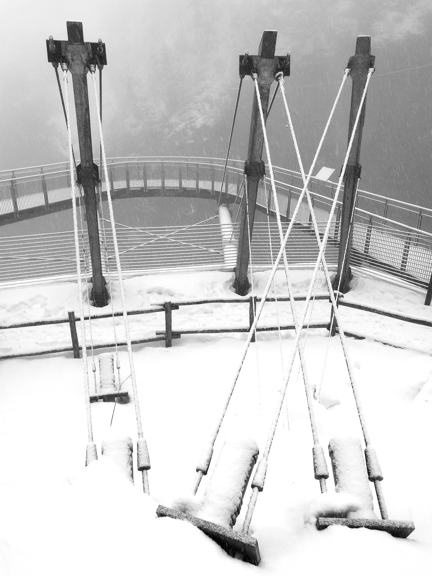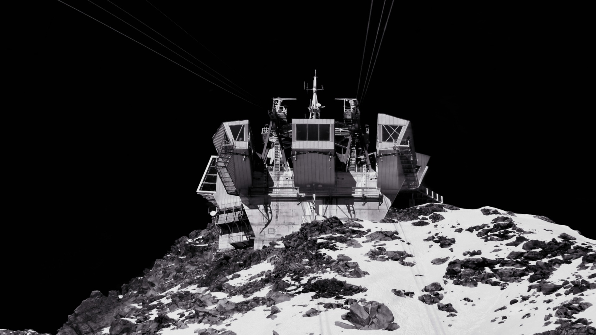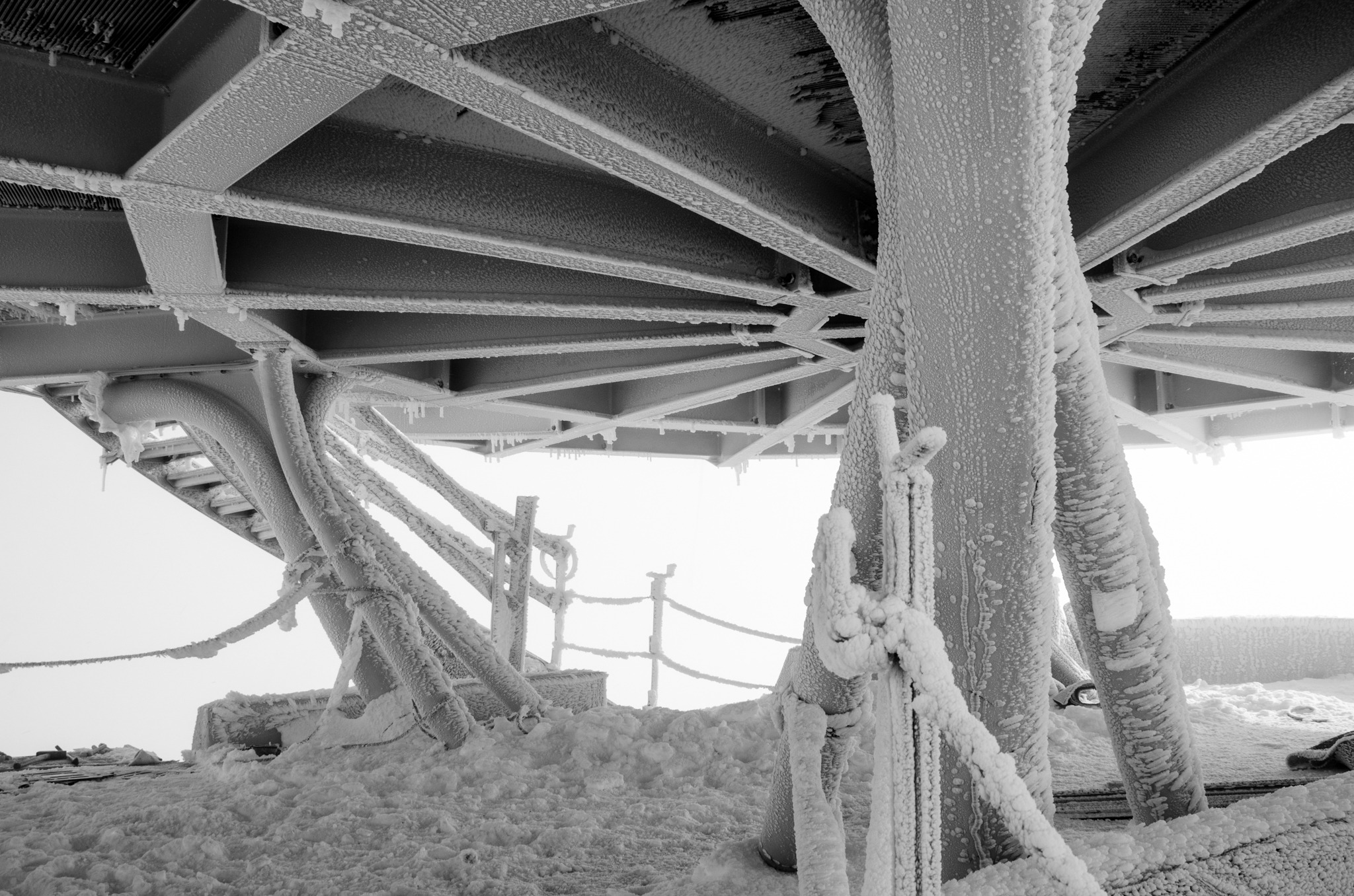 14 - Carta Andrea - 45.765974 N, 6.980951 E. La neve che tutto copre non sembra avere il sopravvento sulla struttura sospesa. Al contrario le linee di forza di tiranti e travi vengono enfatizzate dalla neve e dal contrasto bianco/nero della foto