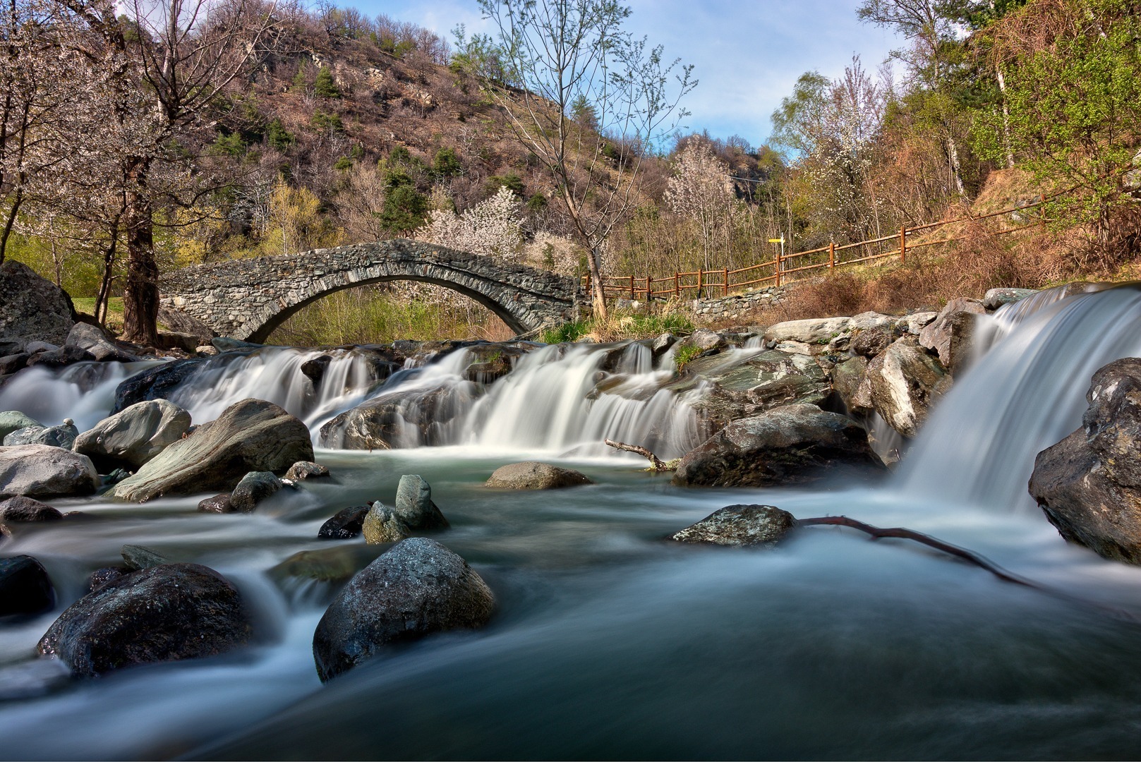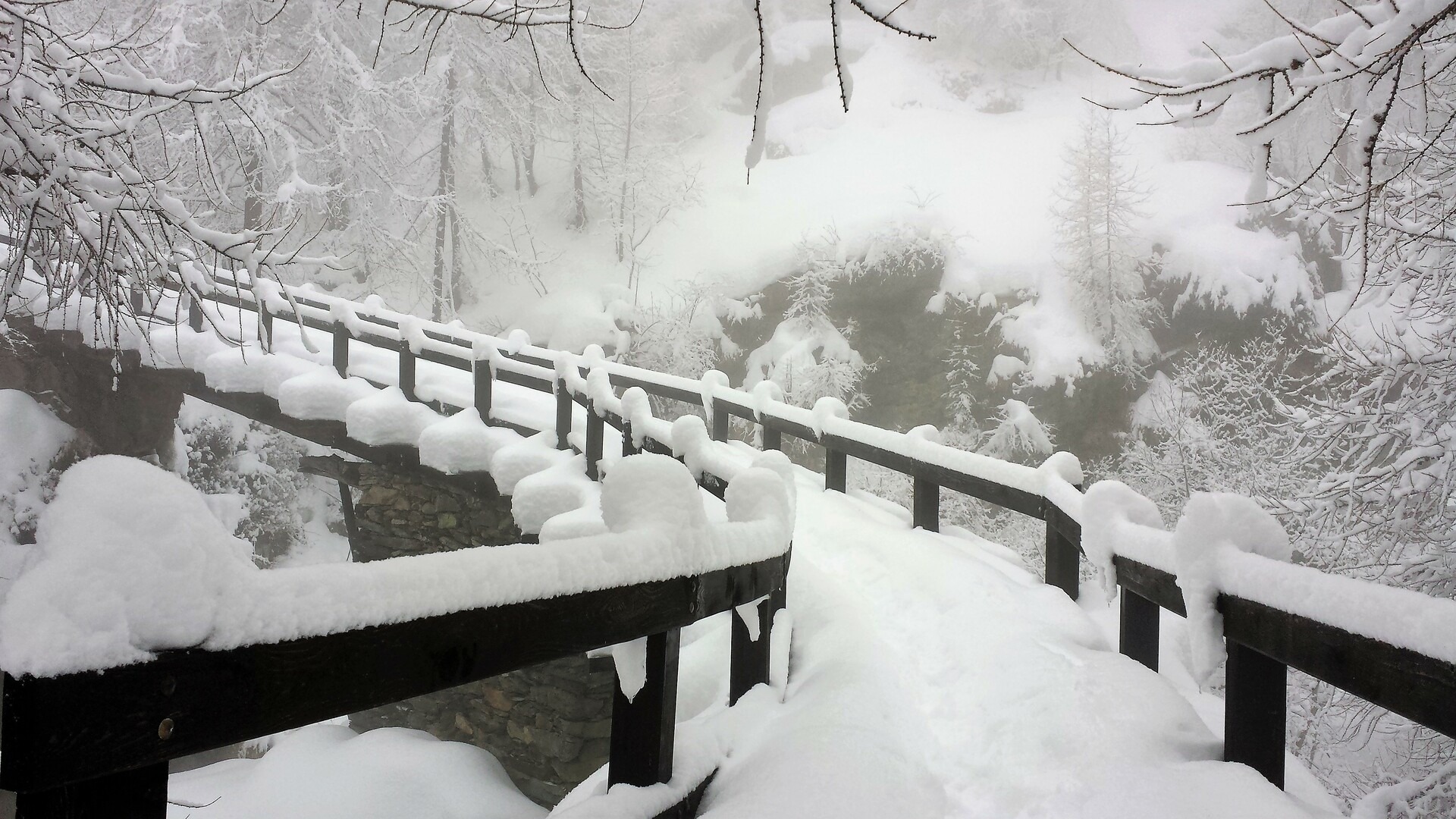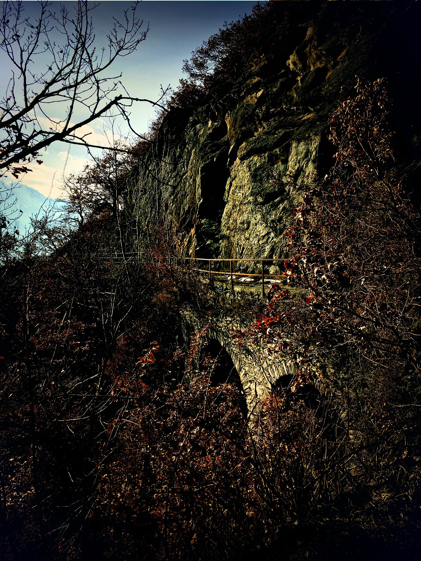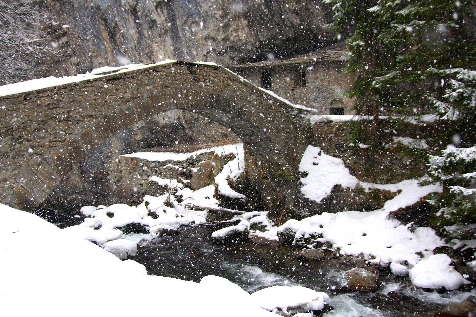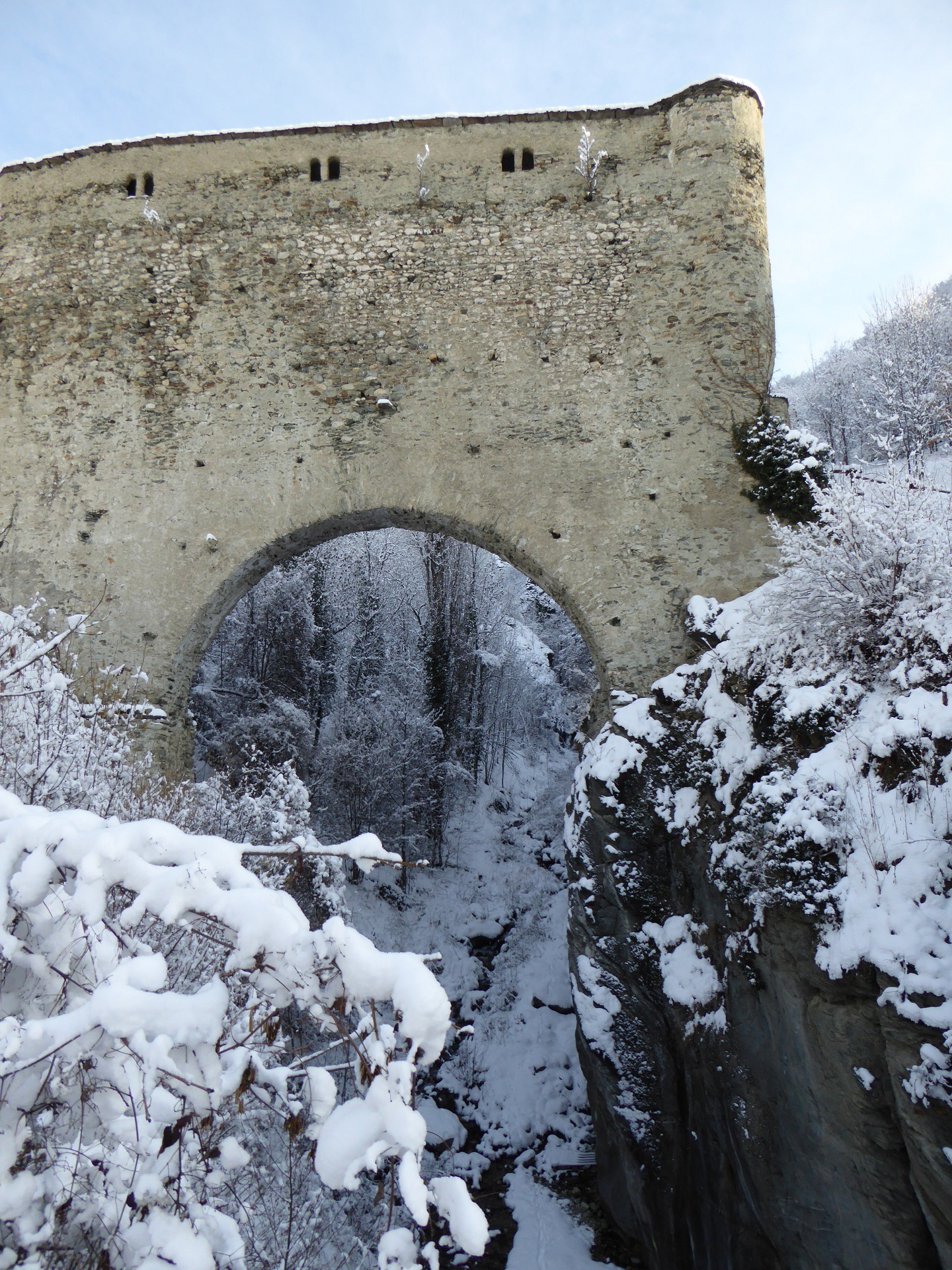 15 - Carta Andrea - 45.763204 N, 6.987293 E. L’imponenza del ponte e la costruzione in pietra appoggiata alla roccia, raffigurano un quadro dipinto in un’altra epoca. L’effetto viene evidenziato dal torrente, dalle tenui tinte di verde, tortora e dai numerosi fiocchi di neve