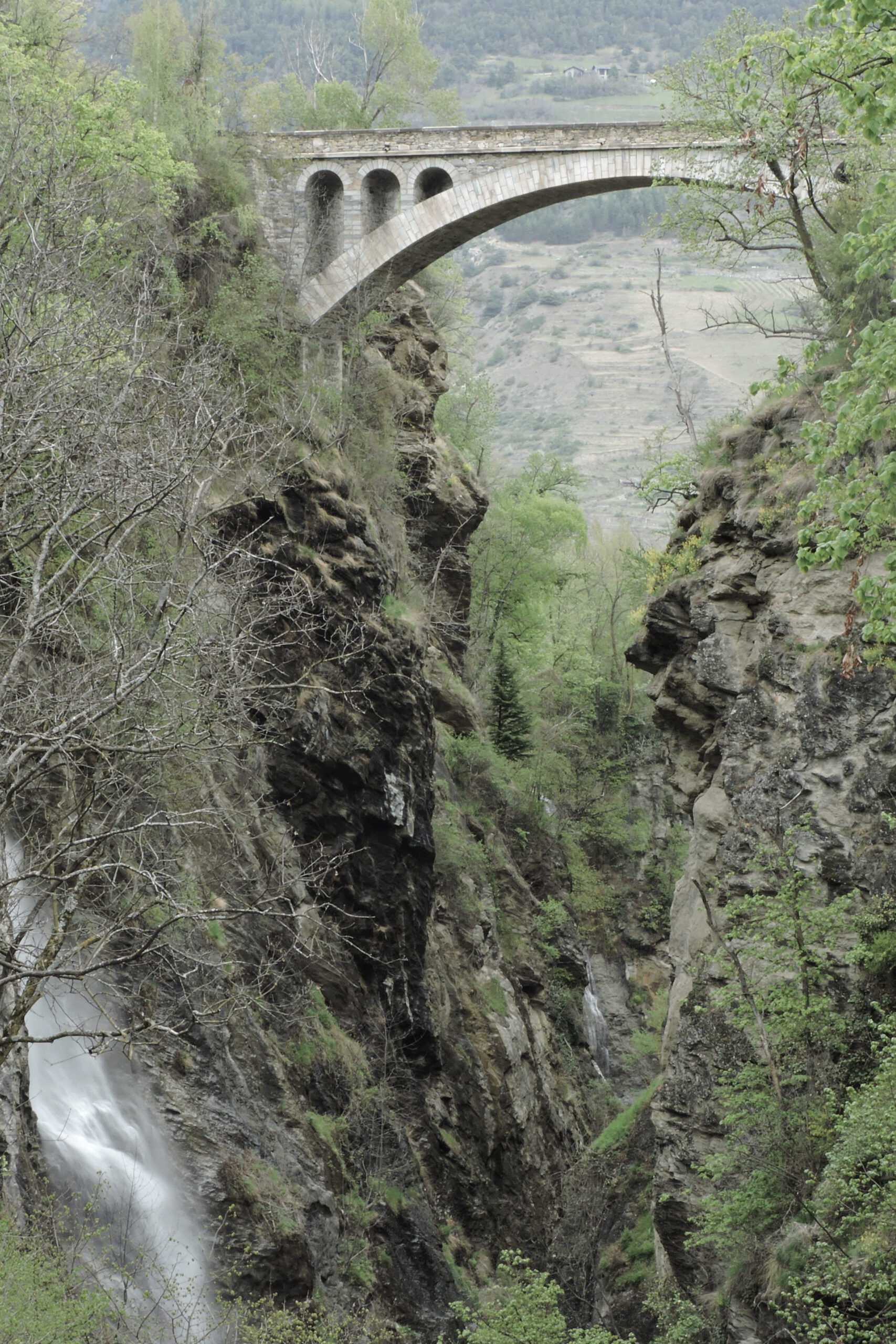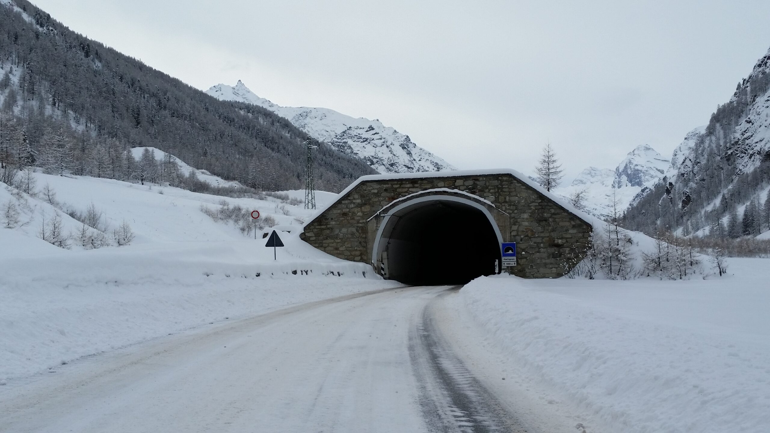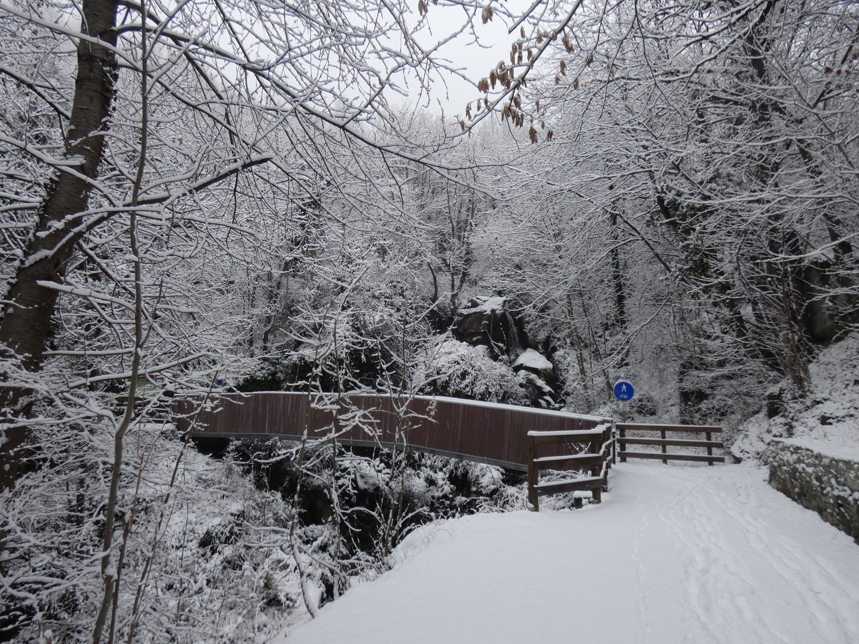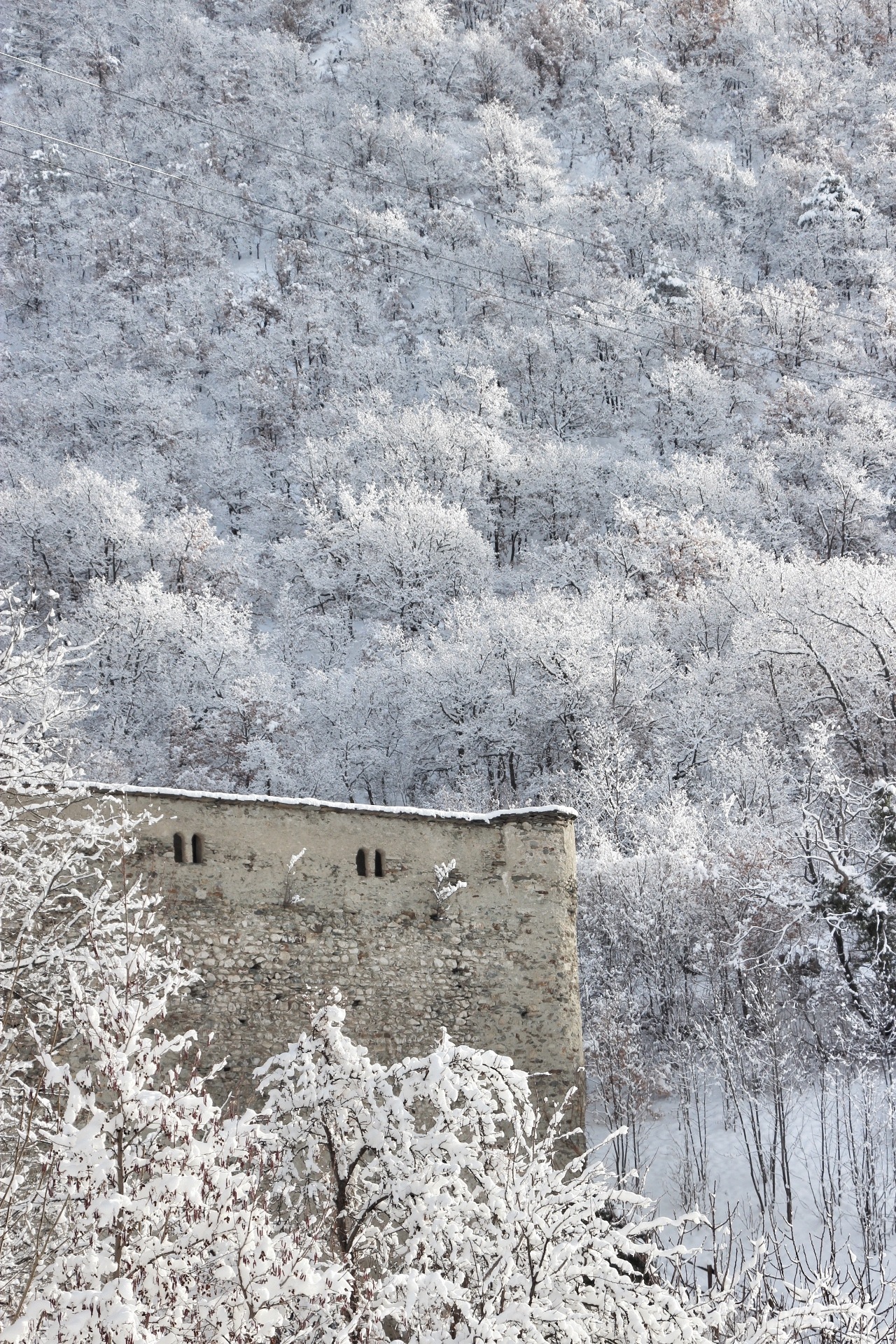 15 - Carta Andrea - 45.763204 N, 6.987293 E. L’imponenza del ponte e la costruzione in pietra appoggiata alla roccia, raffigurano un quadro dipinto in un’altra epoca. L’effetto viene evidenziato dal torrente, dalle tenui tinte di verde, tortora e dai numerosi fiocchi di neve