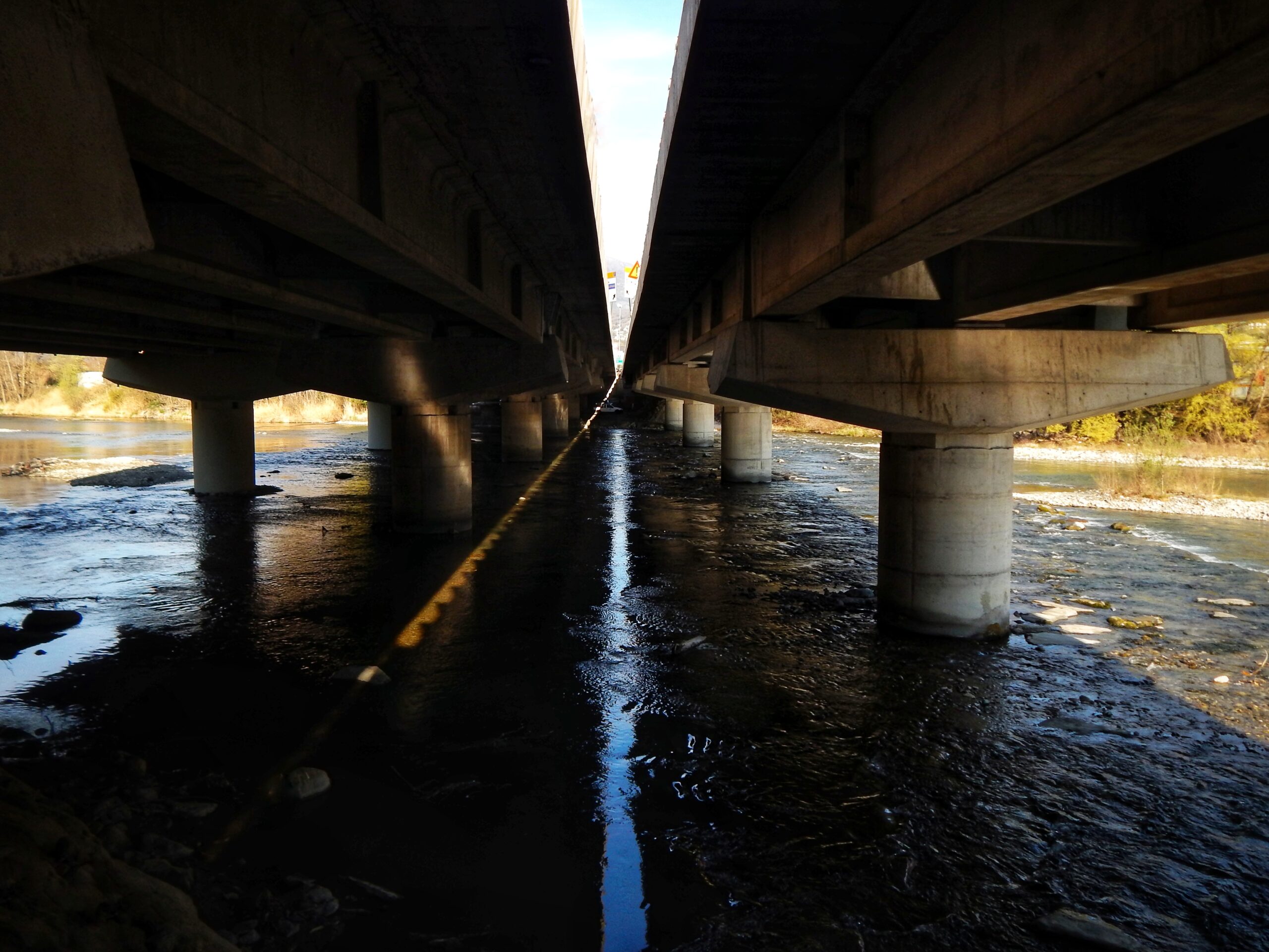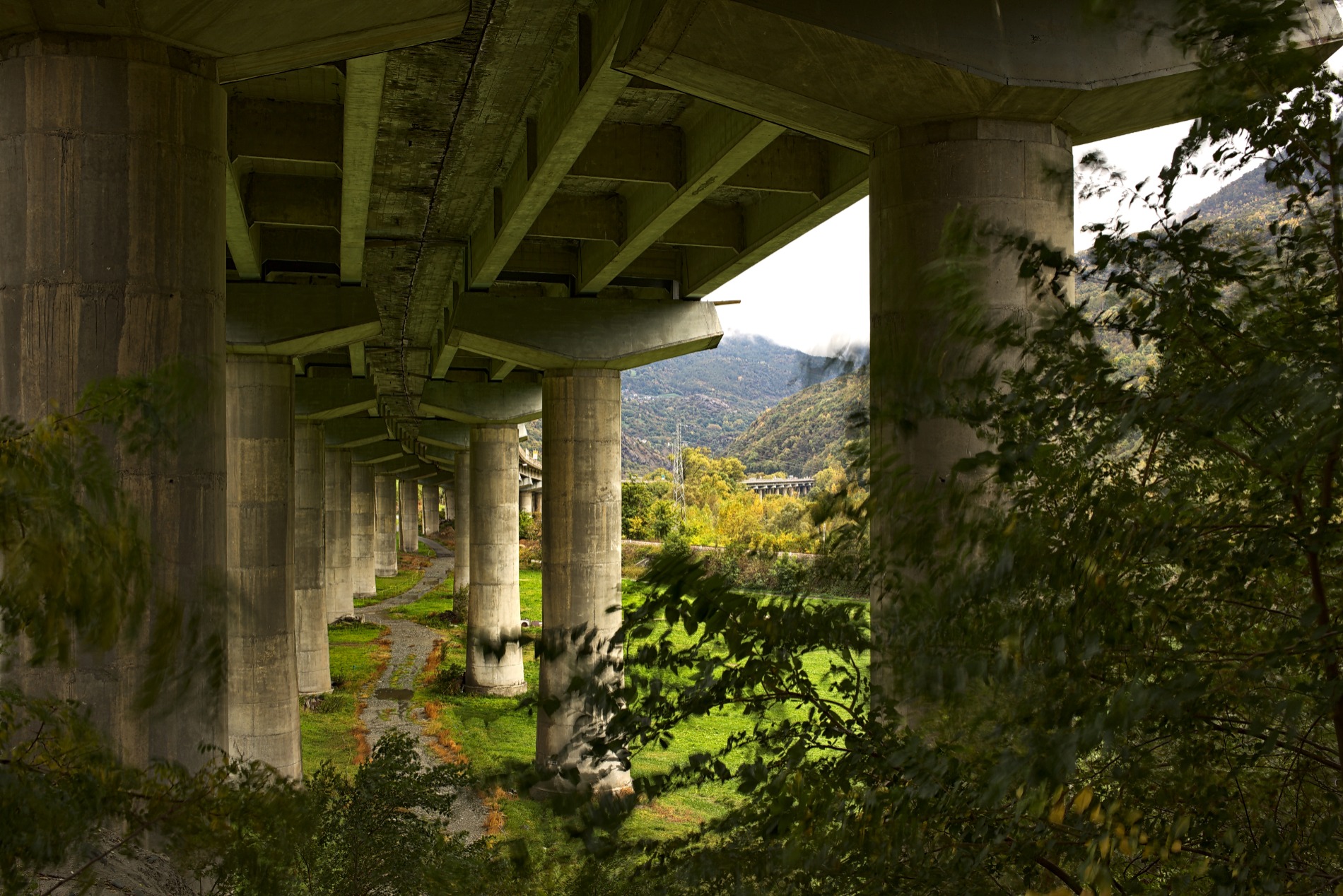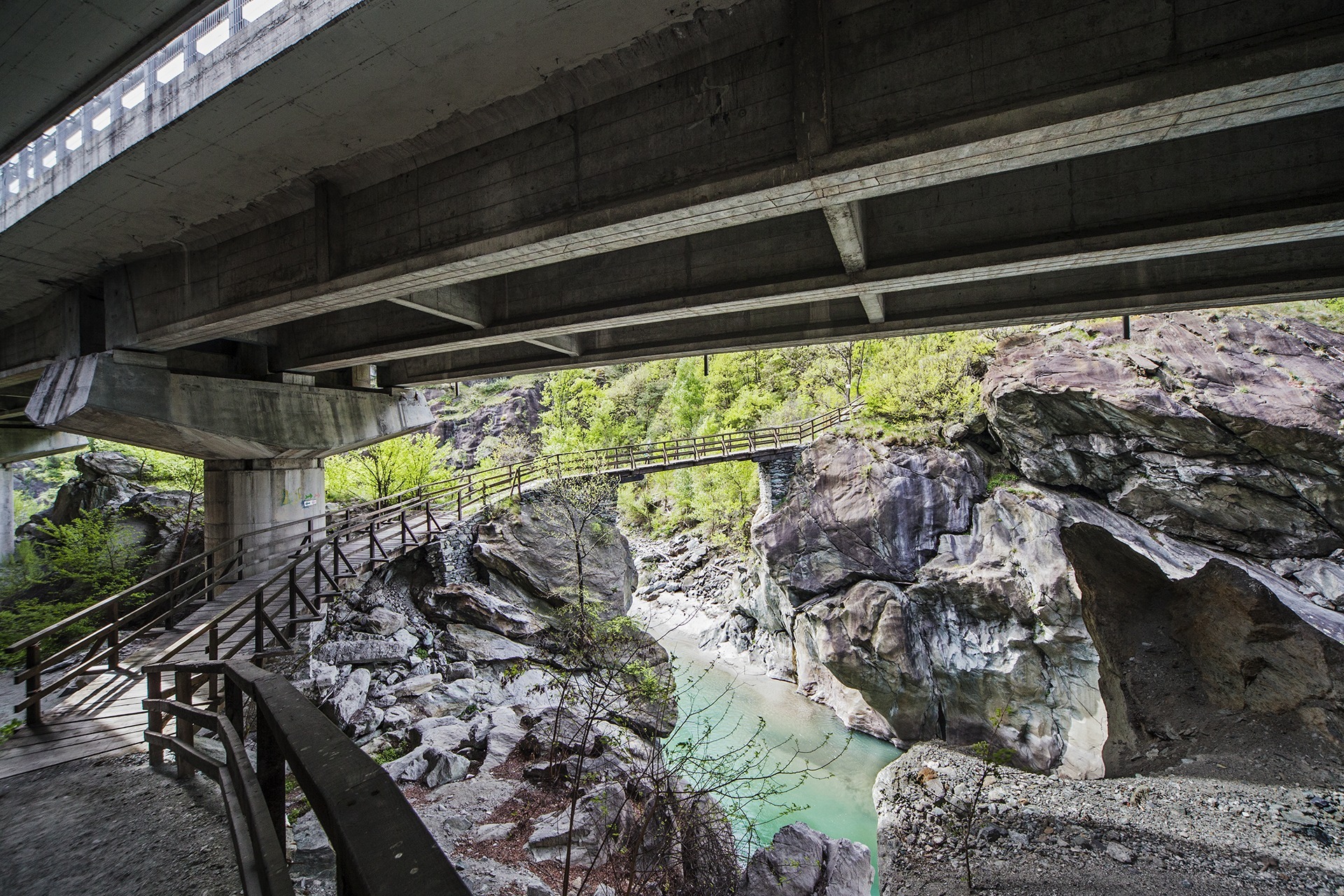 112 - Sasdelli Luigi - Tit-Sotto il viadotto la capra campa .....; Il "ponte delle capre", sulla Dora, a diretto contatto con il viadotto autostradale al termine del percorso ciclo-pedonale "Lungodora" nel Comune di St. Vincent quasi al confine con Montjovet.