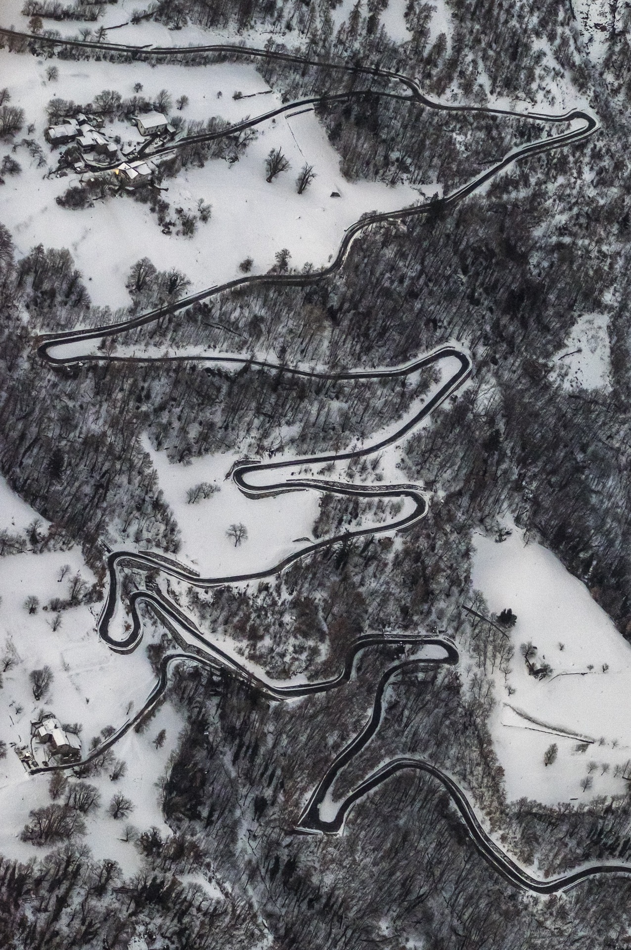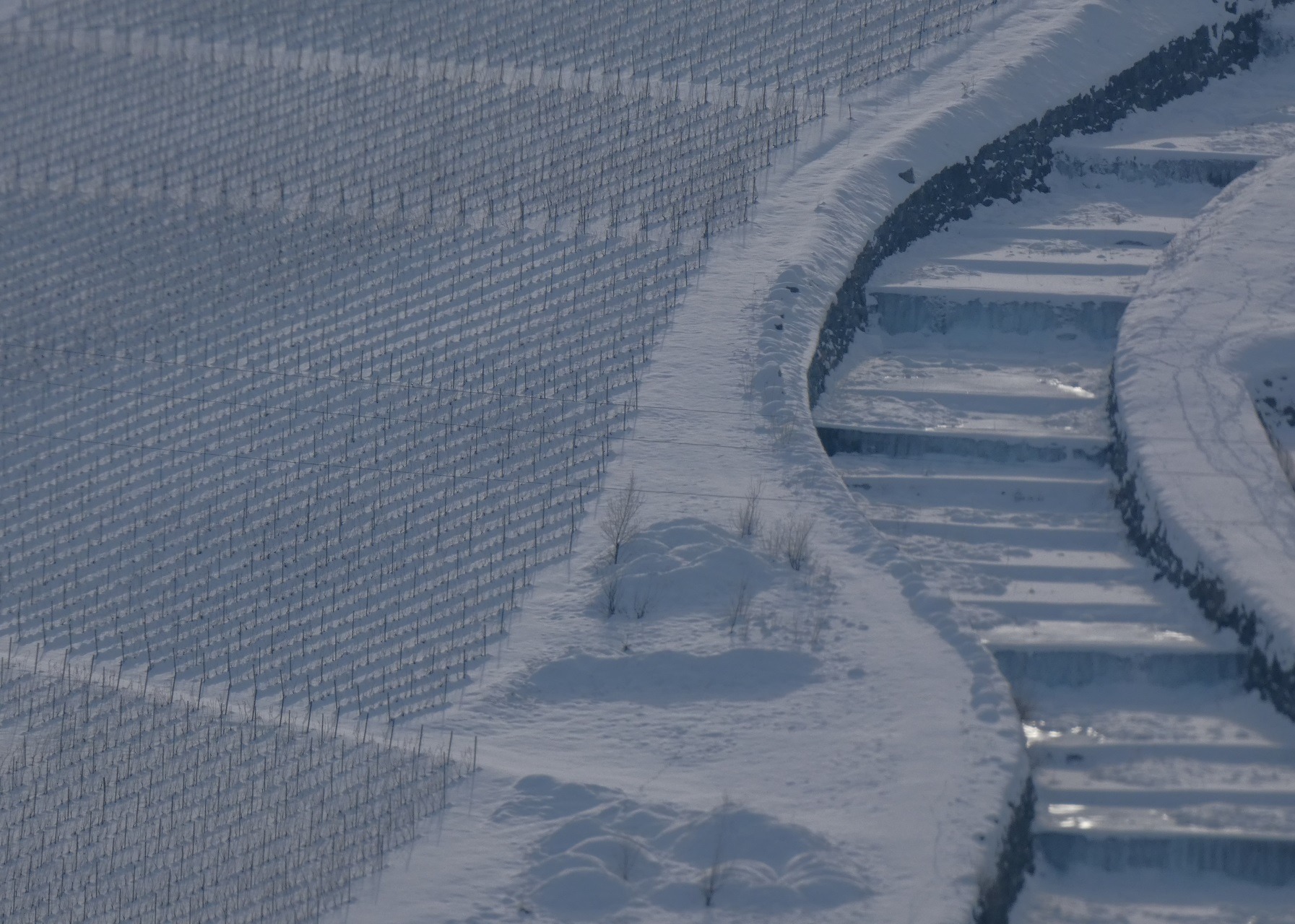 12 - Massa Micon Enzo - STRADA TRA LE VIGNE - un velo di neve evidenzia le vigne di Charvensod mentre il nero dell'asfalto trasforma la strada in un serpente sinuoso che addomestica il pendio appiattito dalla visuale dalla mongolfiera