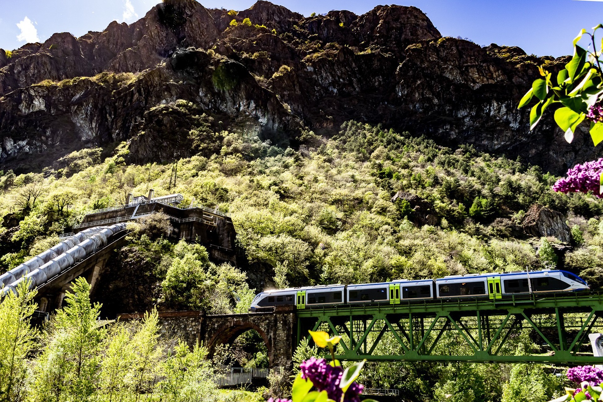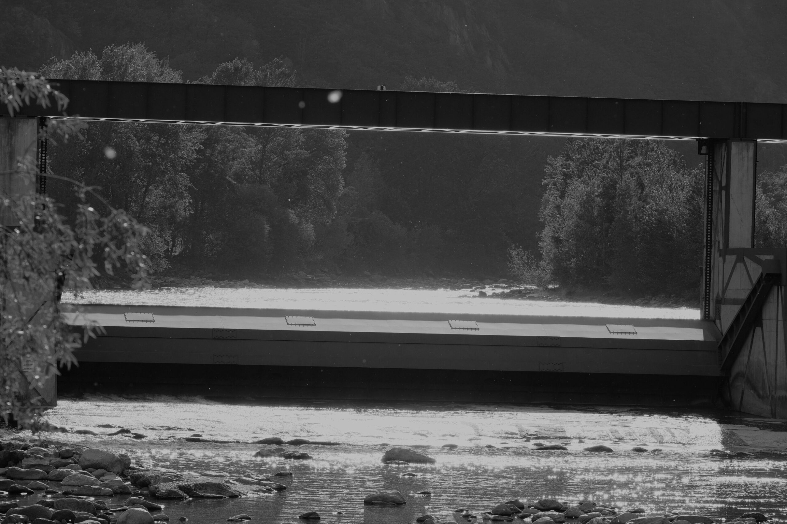 117 - Domaine Martina - Lo scatto cattura un istante in cui il treno, il ponte e l'acqua della centrale sono sospesi. Le opere ingegneristiche si incastrano nel paesaggio primaverile richiamato dalla fioritura del lillà.
