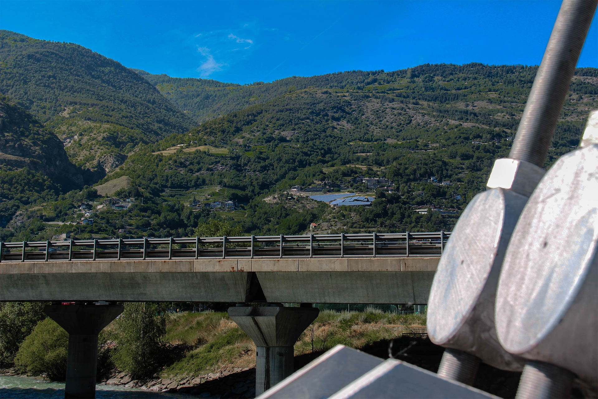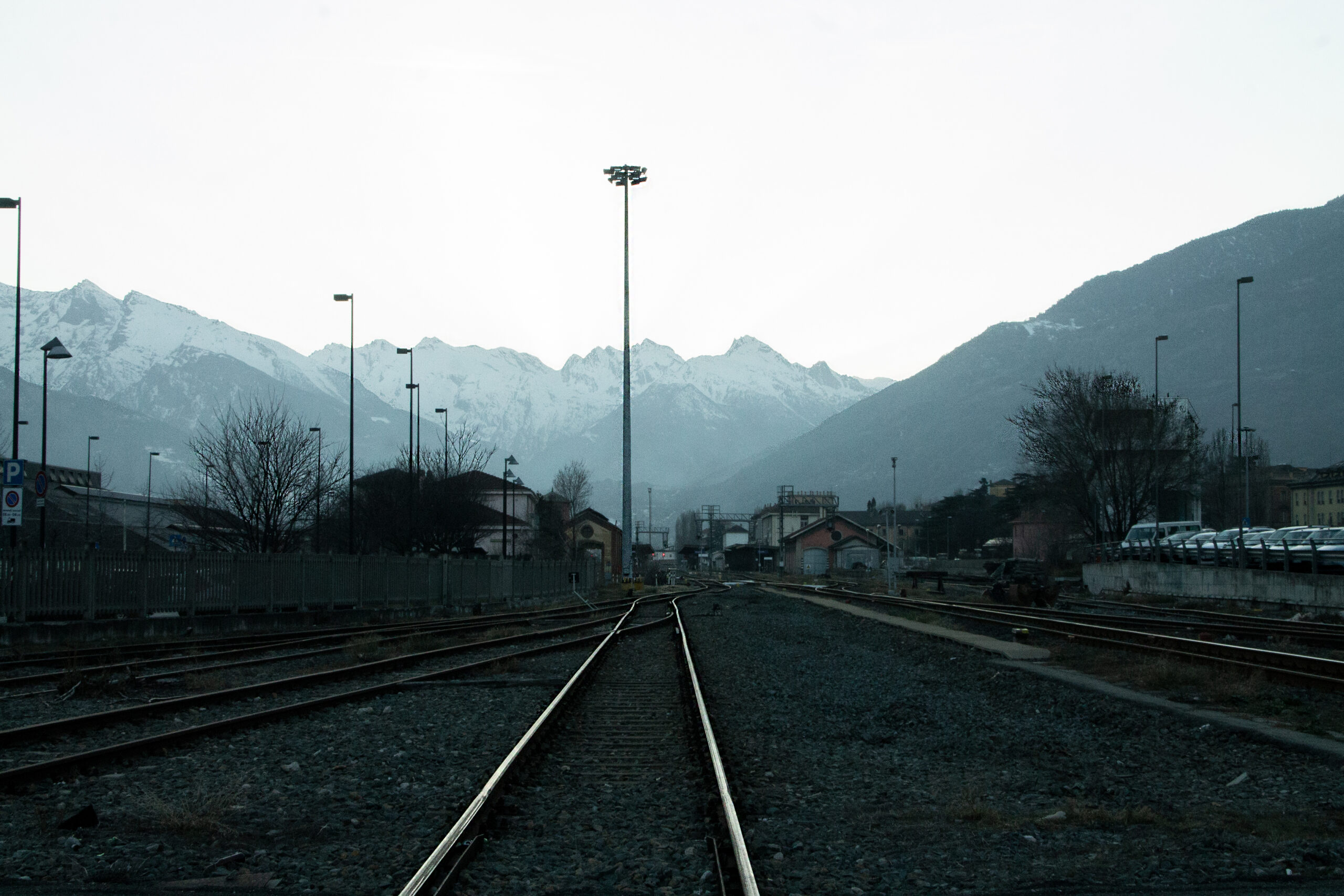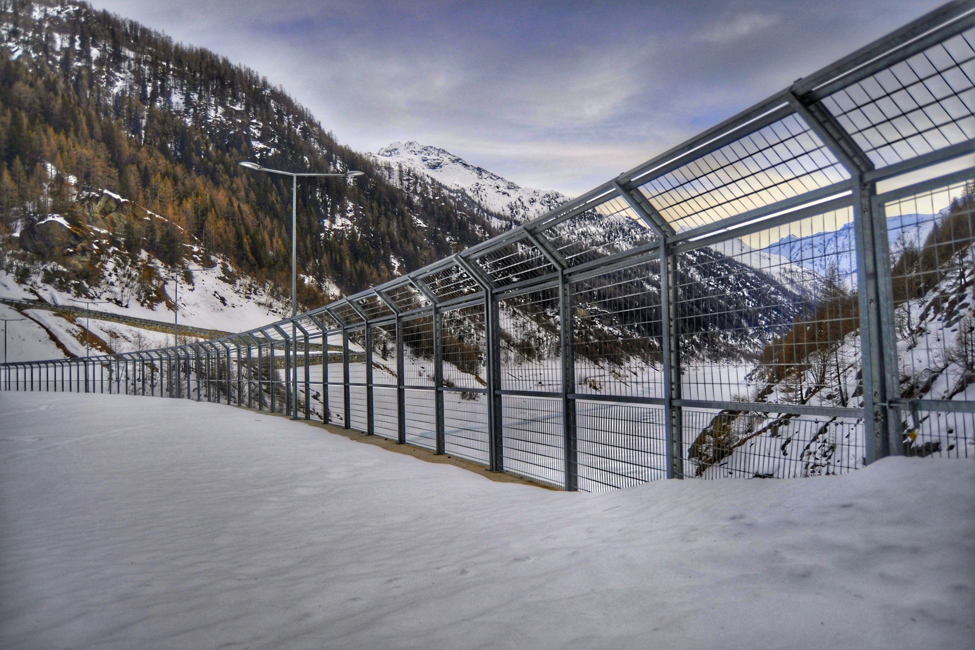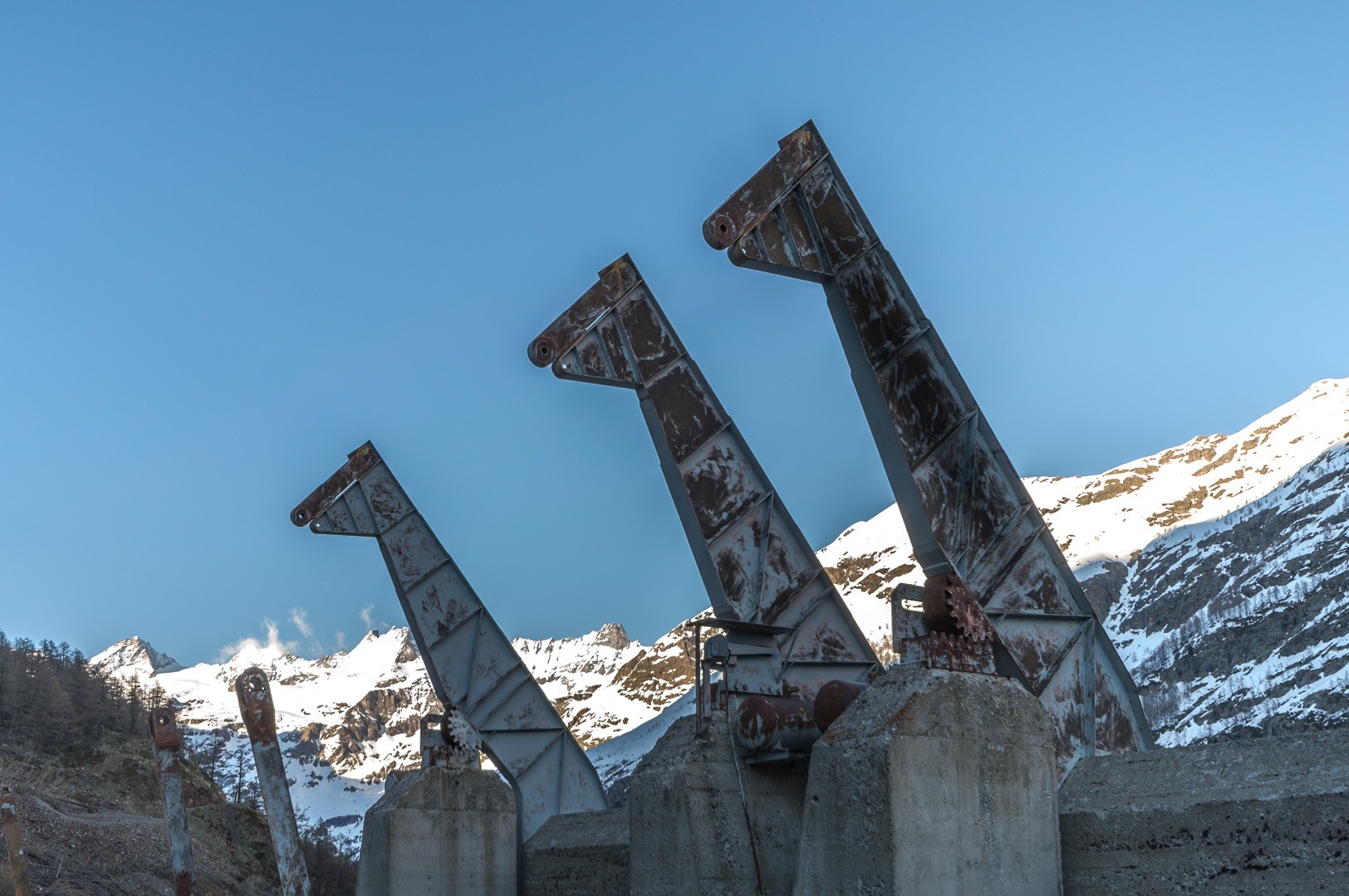 123 - Carta Andrea - Fredda primavera - Saint Denis - Le cime ancora innevate e il cielo parzialmente coperto ritraggono una primavera tardiva, fredda quanto il particolare di una struttura in acciaio.