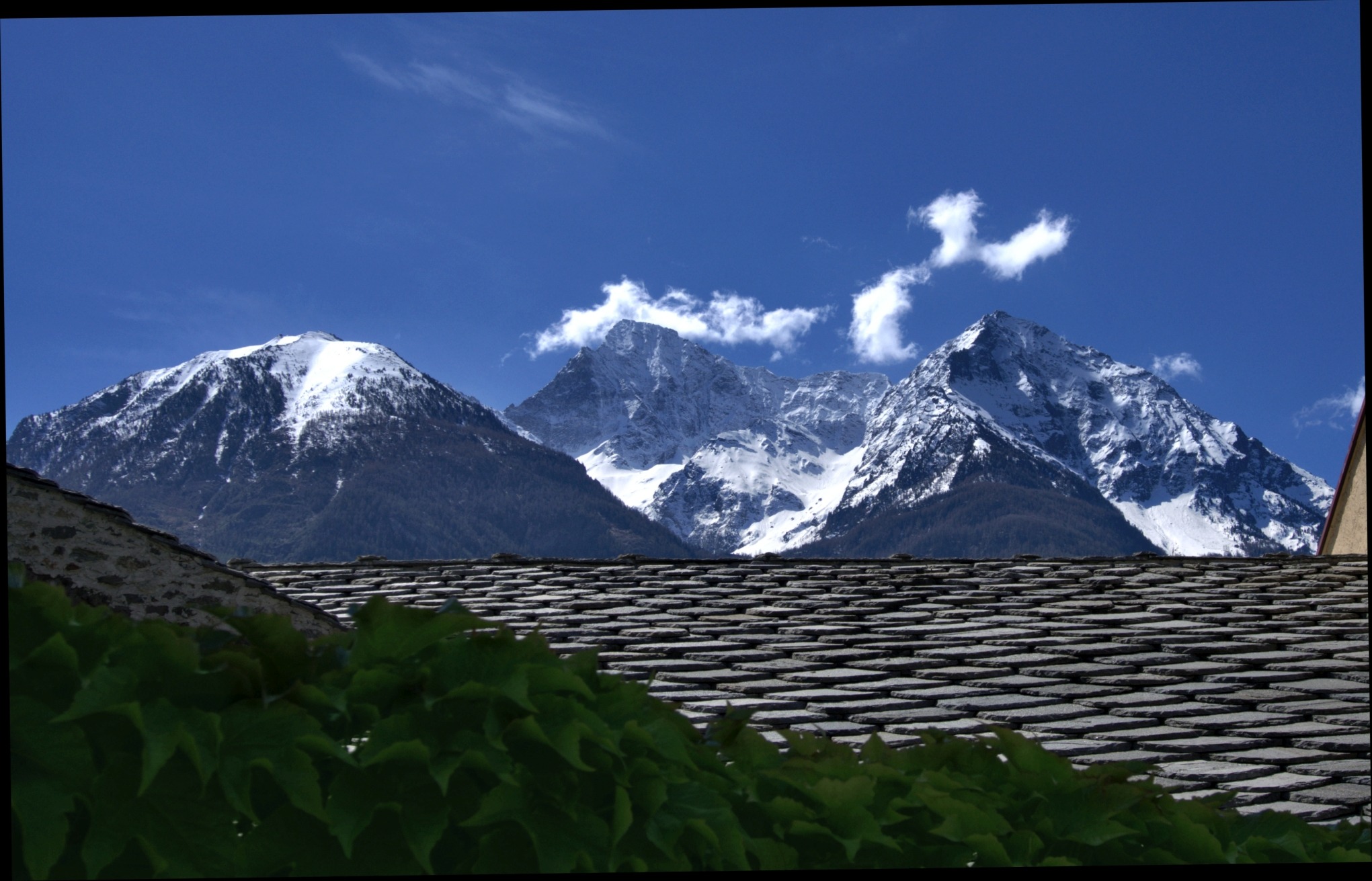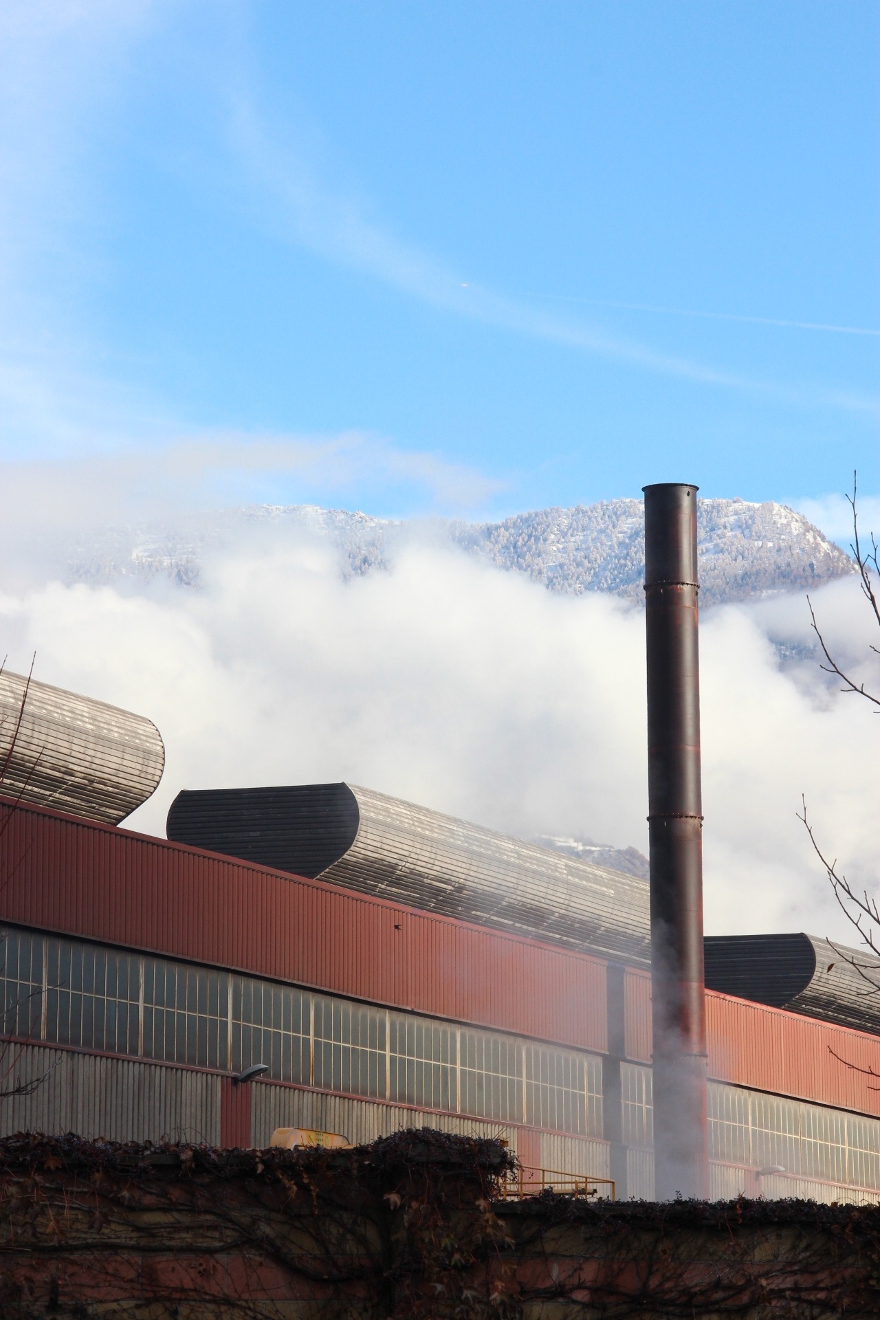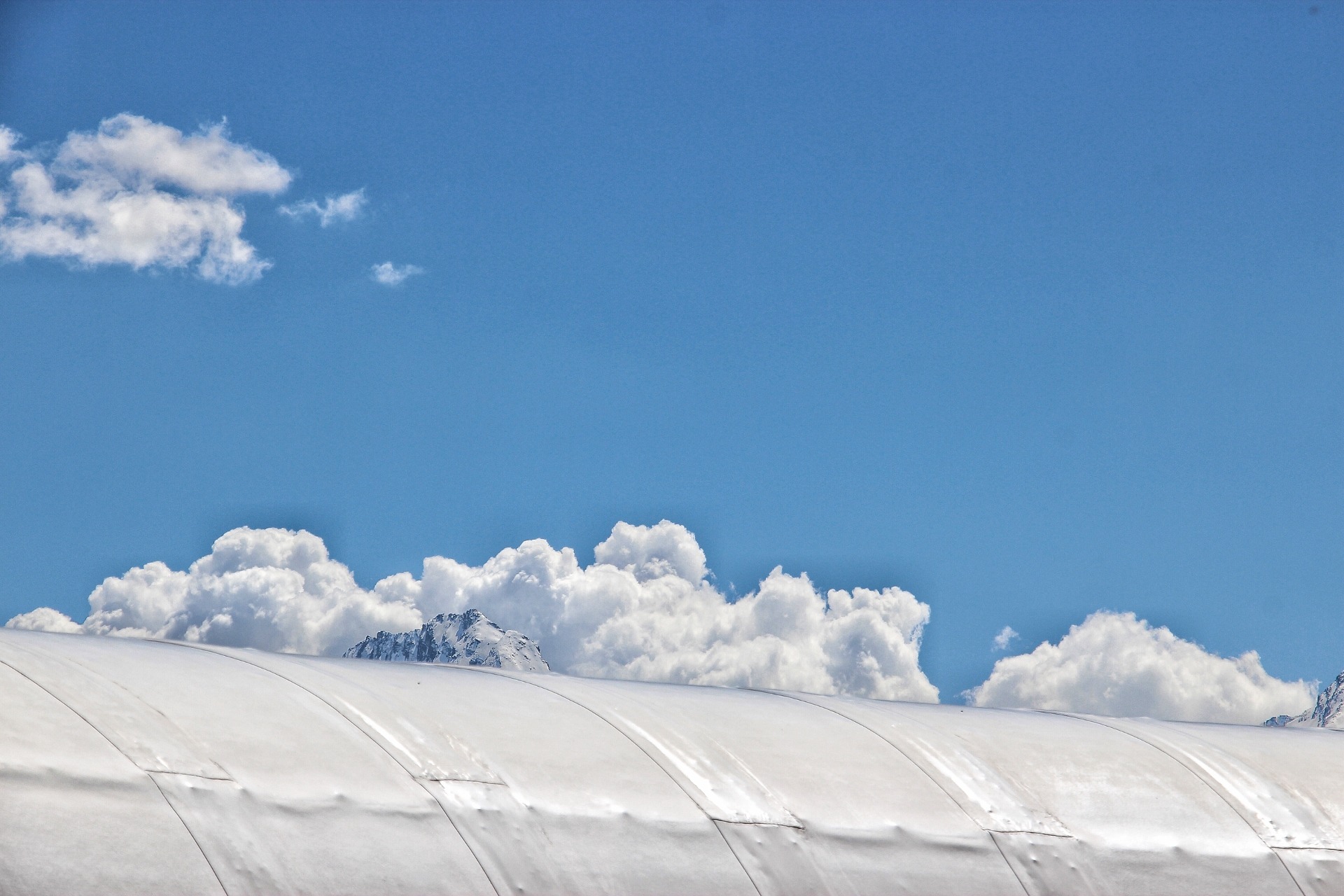 123 - Carta Andrea - Fredda primavera - Saint Denis - Le cime ancora innevate e il cielo parzialmente coperto ritraggono una primavera tardiva, fredda quanto il particolare di una struttura in acciaio.