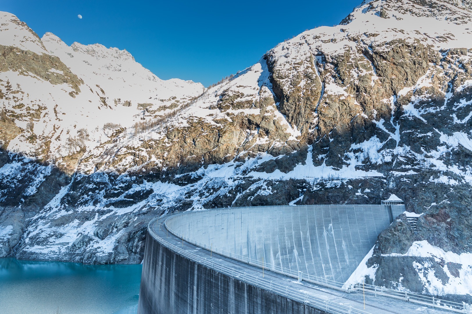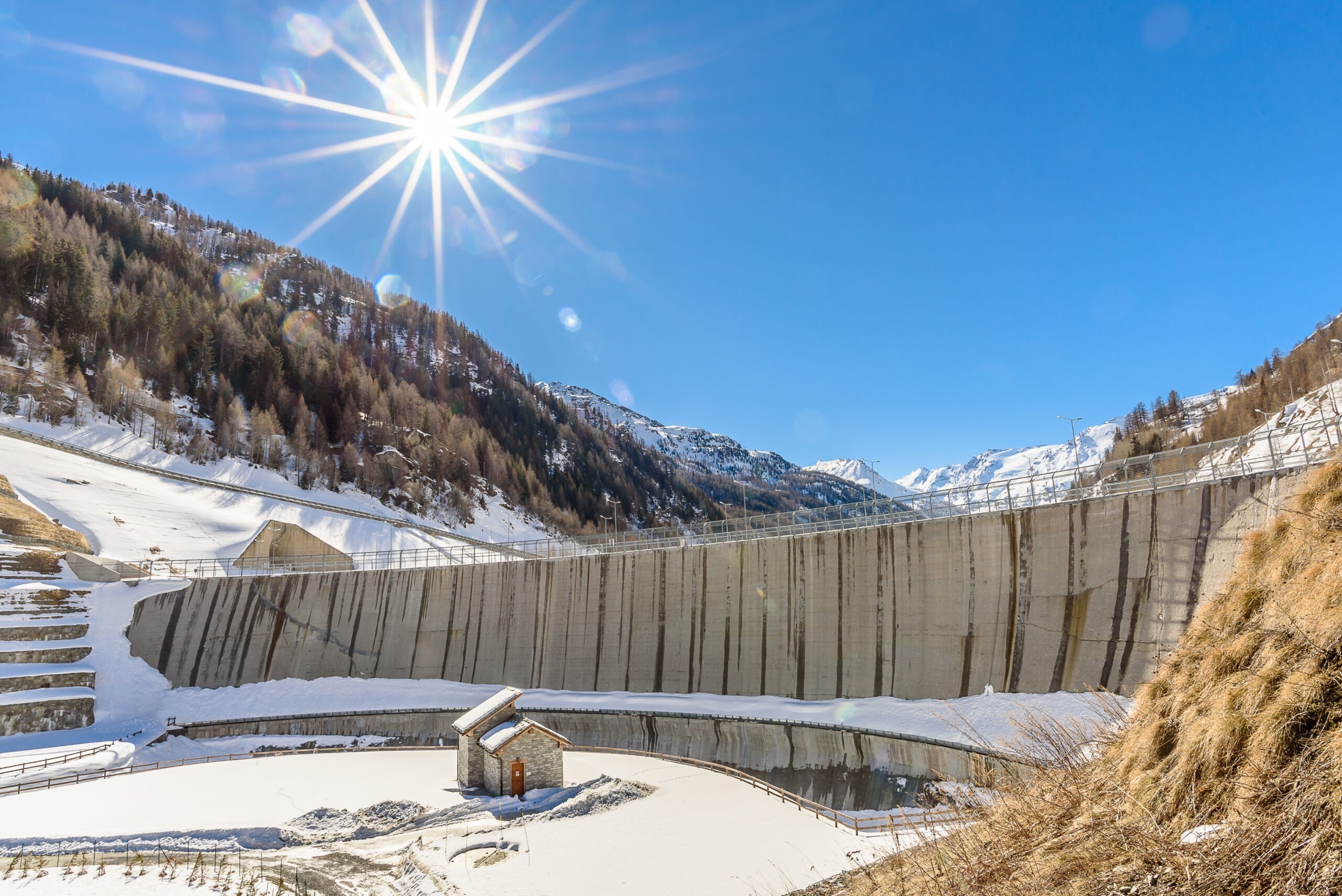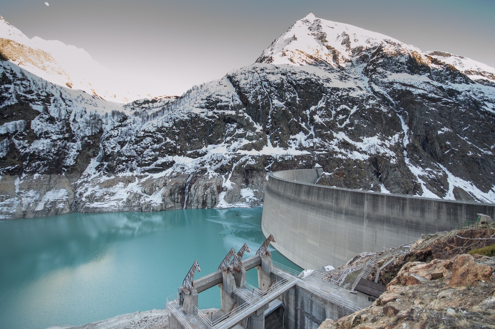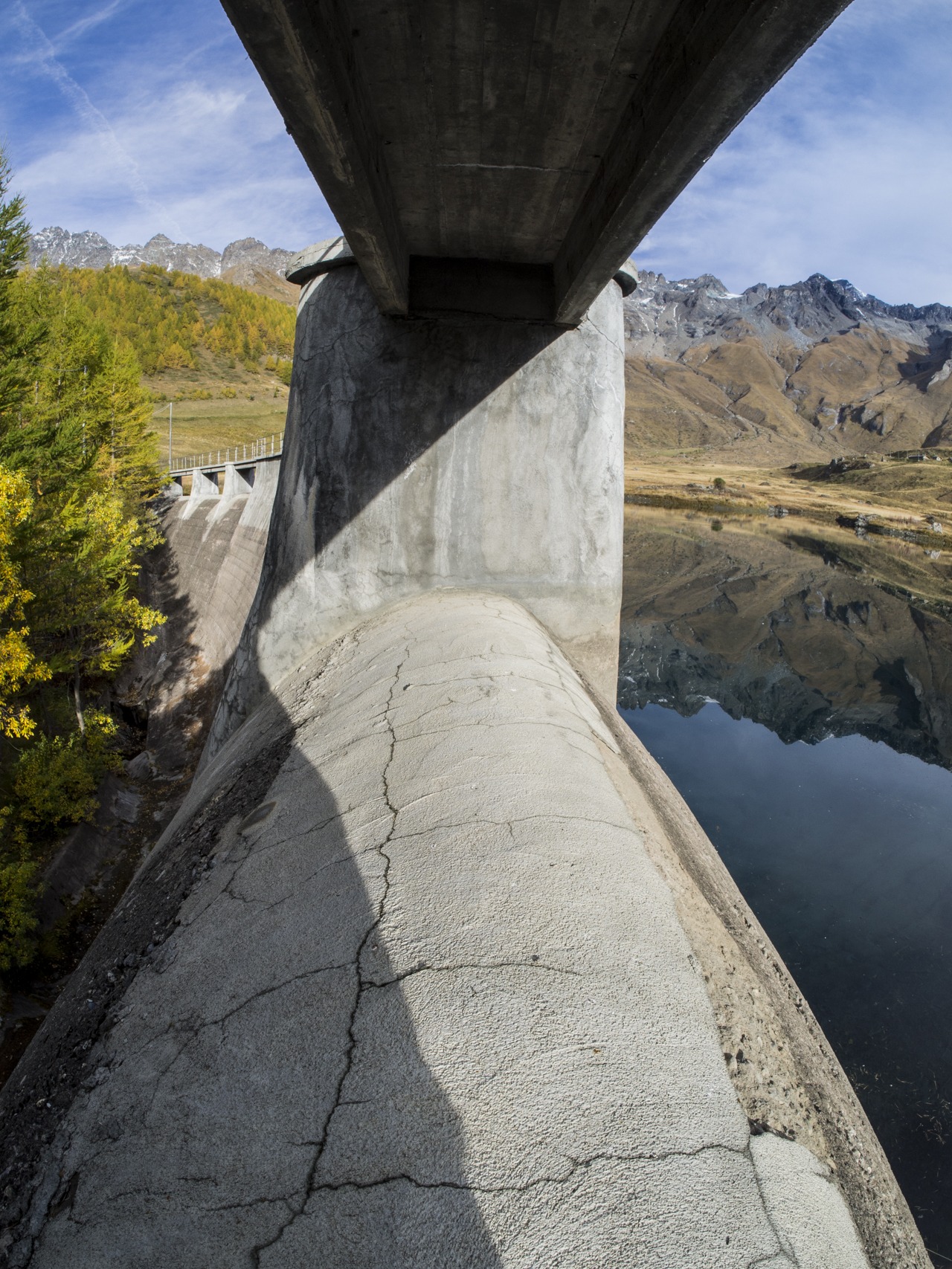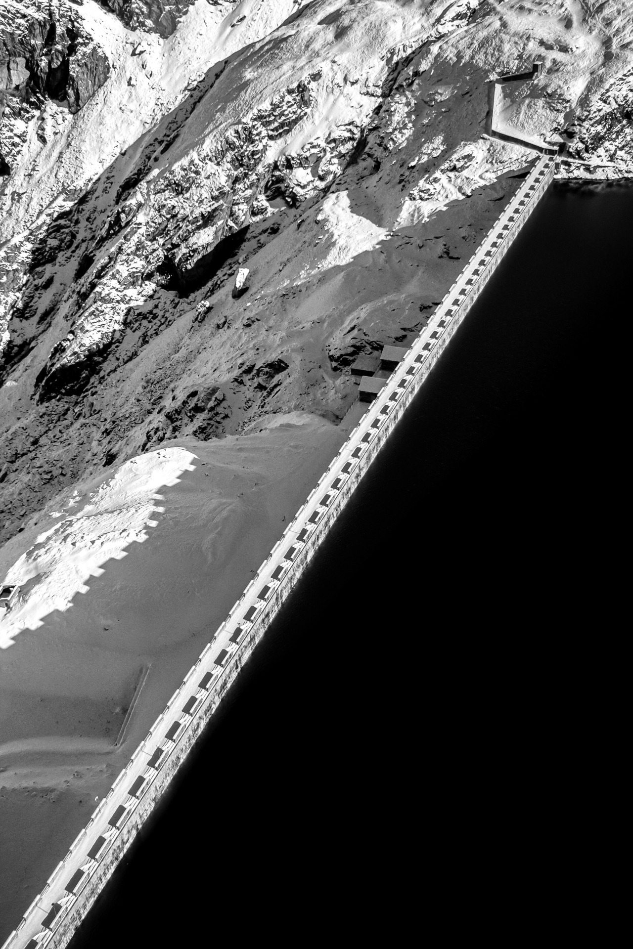 231 - Atzei Lorena - TITOLO: Eclissi di diga. DIDASCALIA: Diga di Place Moulin, Bionaz - Le ombre della montagna lasciano finalmente che il sole esalti l’imponente opera.