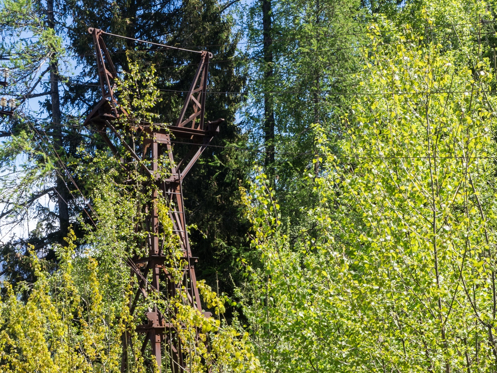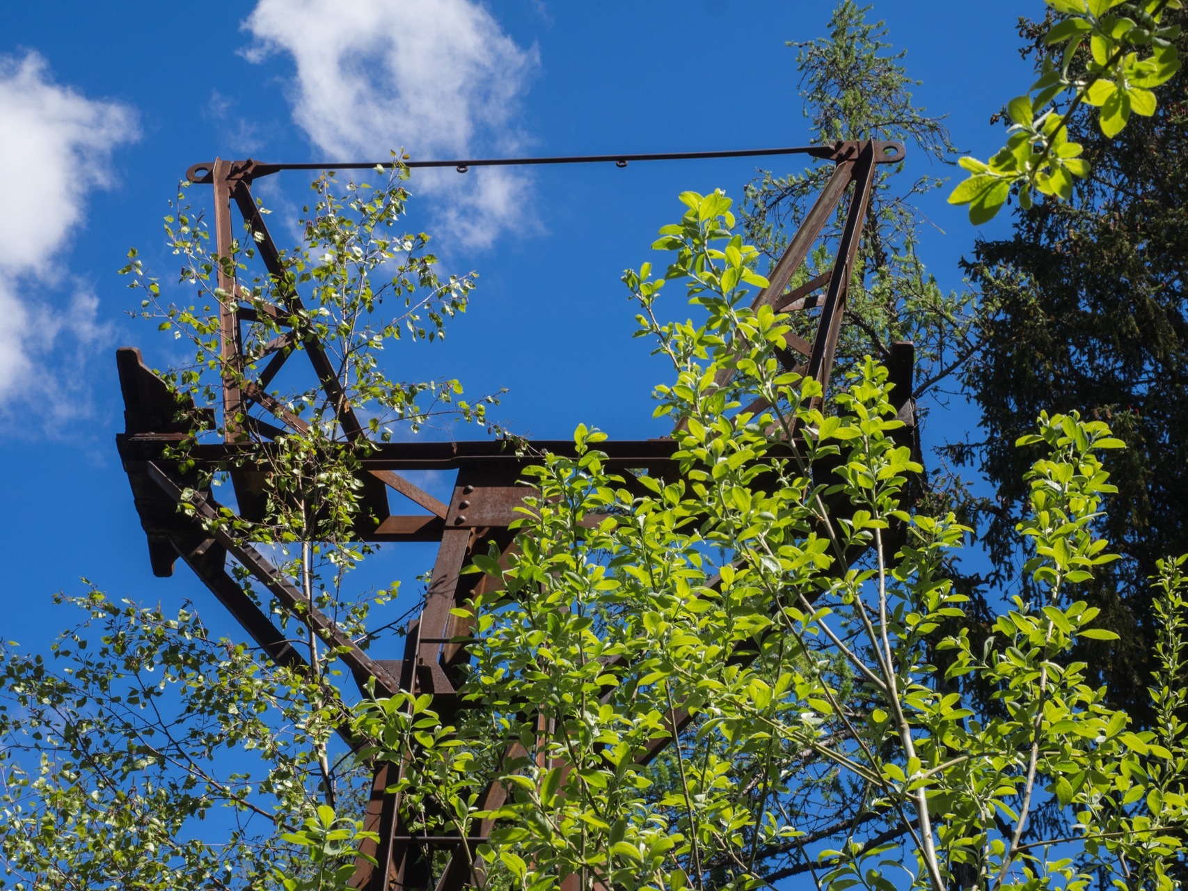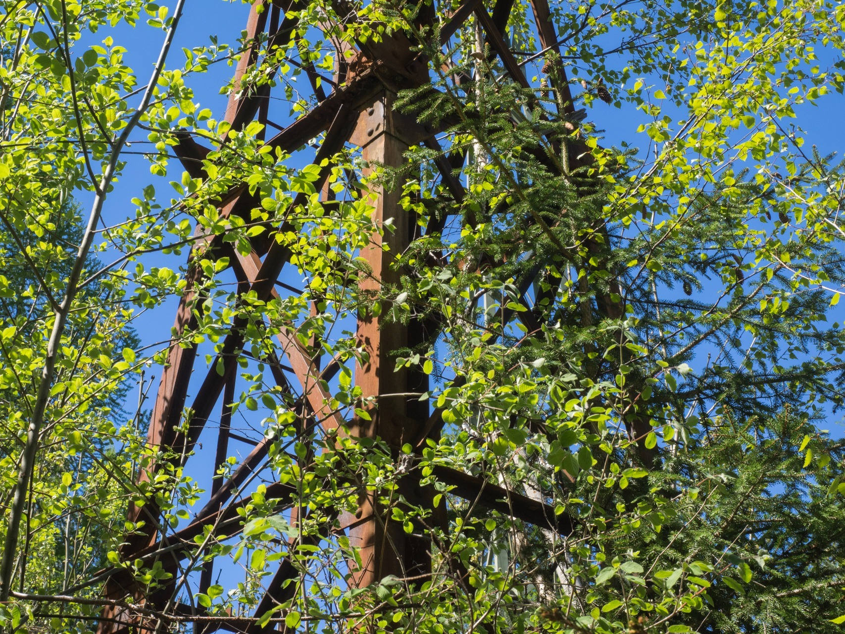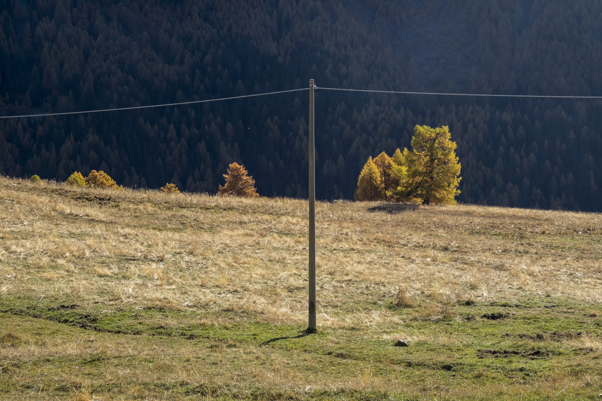 157 - Zanin Franco - Simbiosi_01 – Gressan, frazione Gerdaz, bosco sottostante - Il bosco nasconde le ultime vestigia della teleferica che portava il minerale estratto a Cogne, da Acquefredde fin dentro lo stabilimento siderurgico. Qualche traliccio è rimasto in piedi, ulti