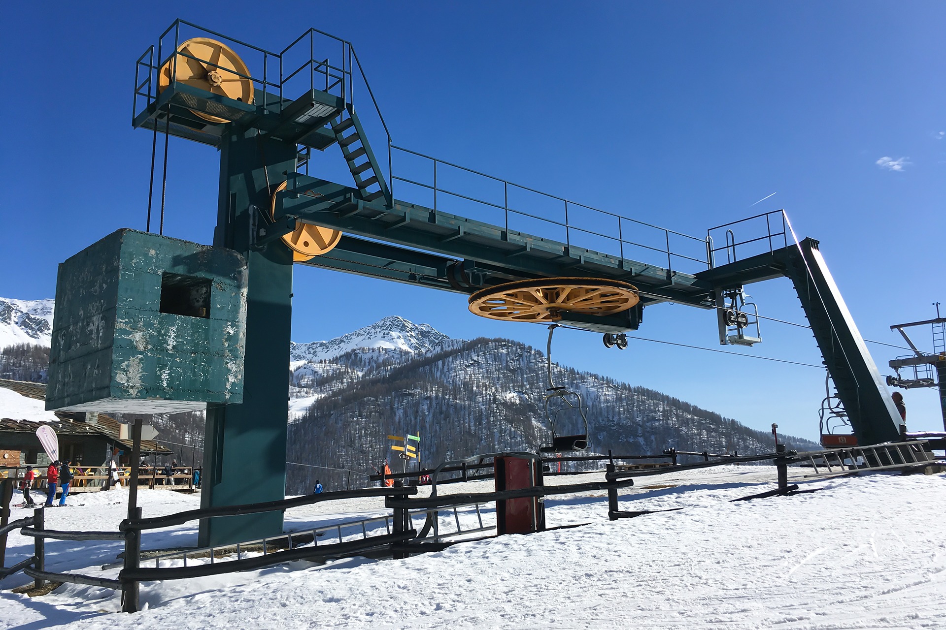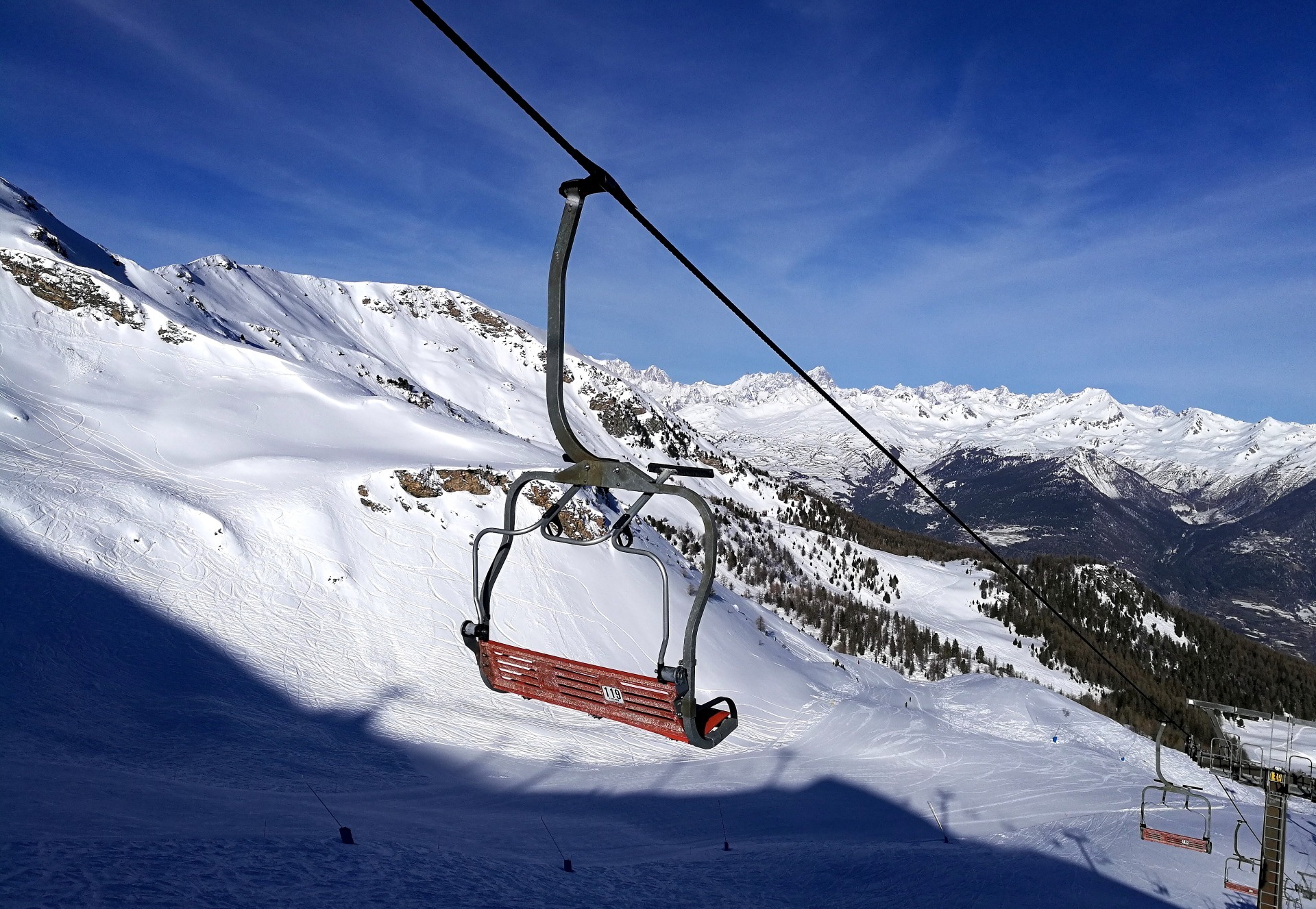 17 - Carta Andrea - 45.661844 N, 7.299191 E. In un paesaggio tipicamente invernale la “panchina” sospesa tra ombra e sole si offre a chi vuole condividere una visuale mozzafiato sulle cime innevate. La struttura portante della seggiovia sembra defilarsi dallo scatto