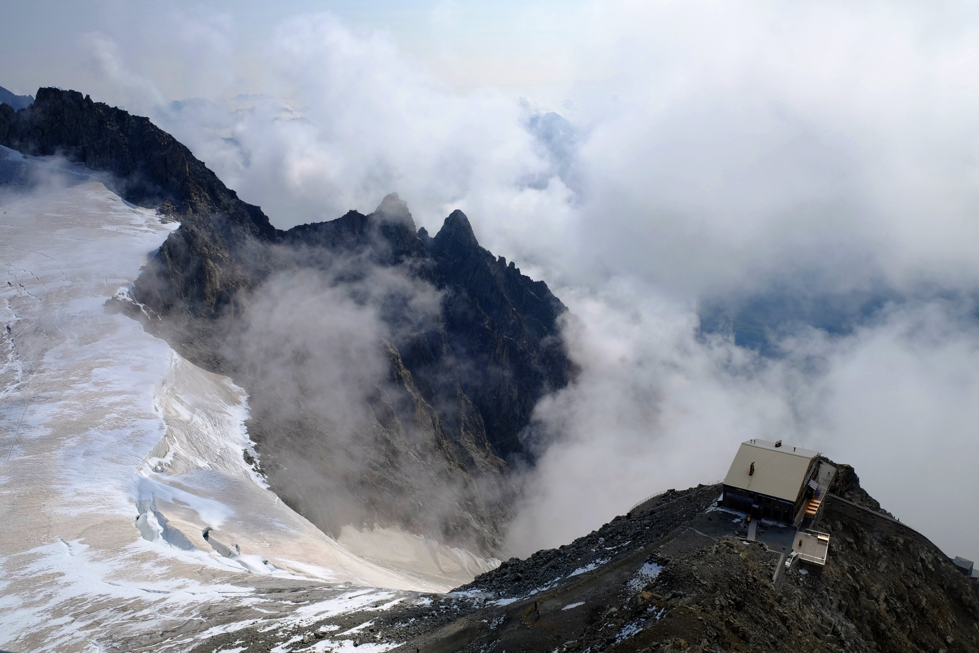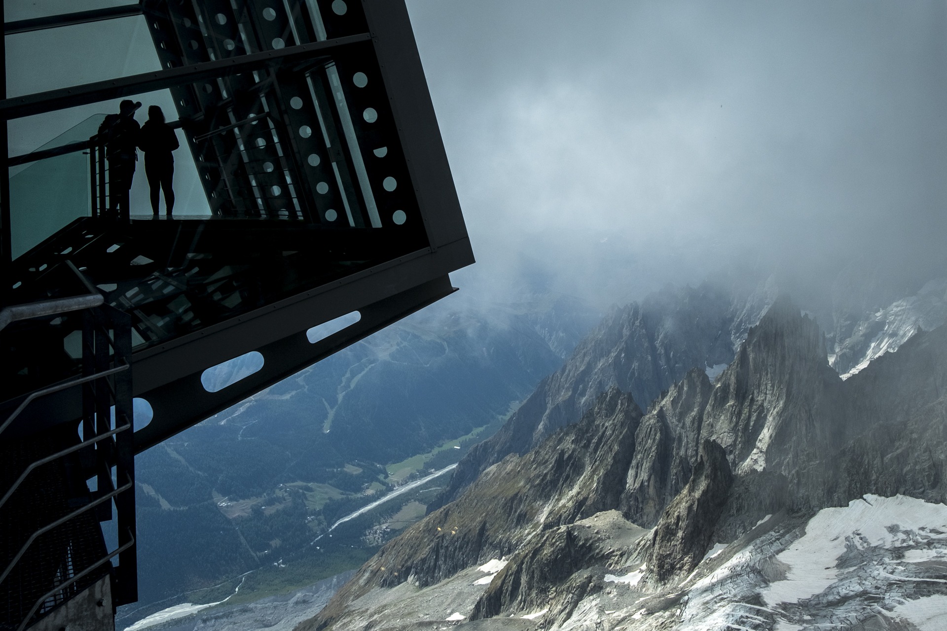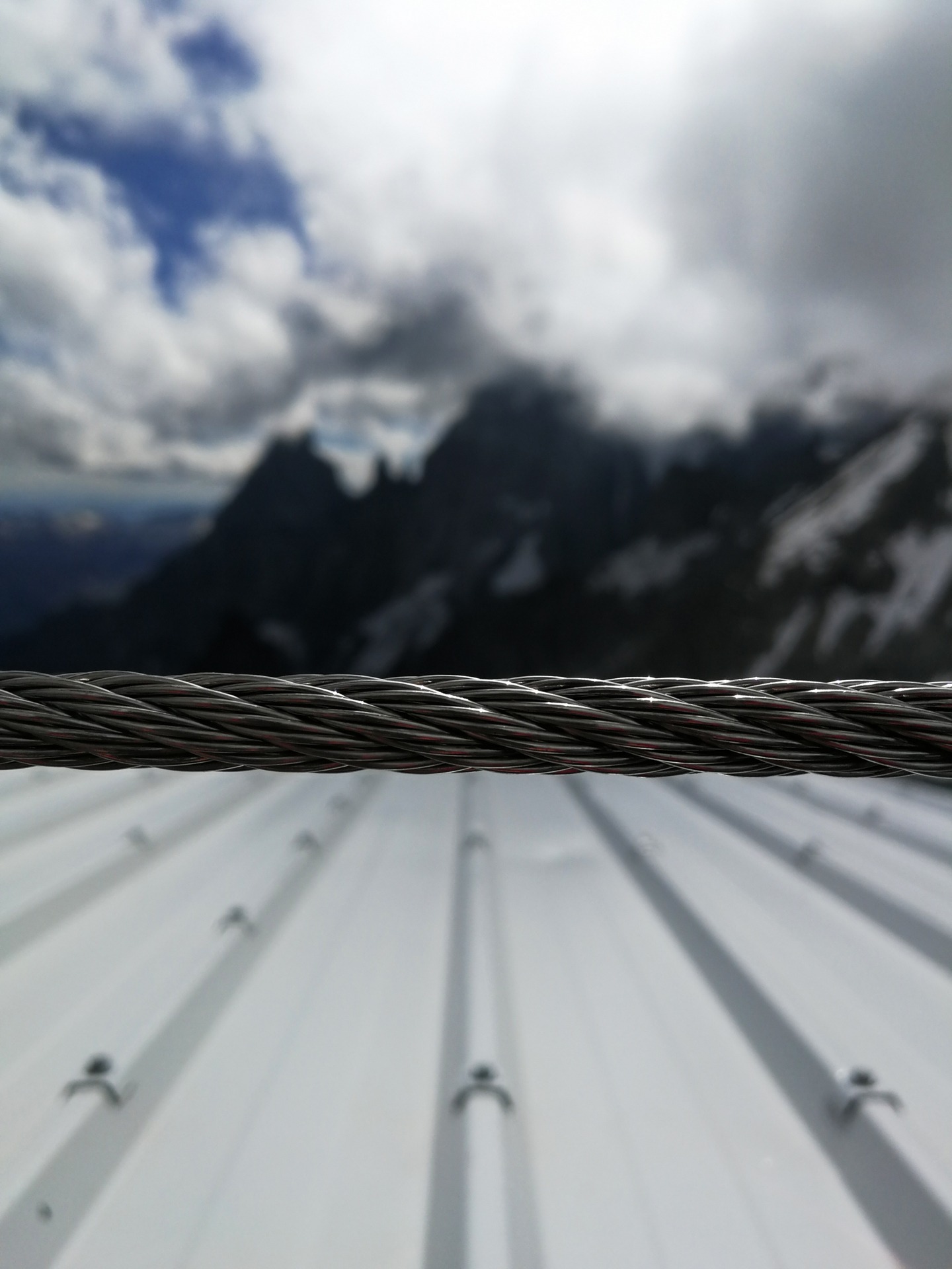 16 - Carta Andrea - 45.765974 N, 6.980951 E. La passerella sospesa sovrastata dalle nubi sembra un essere alieno surreale. Il pannello e la parete rocciosa sul versante opposto, al di fuori delle nubi, danno profondità di campo e riportano l’intera struttura alla realtà