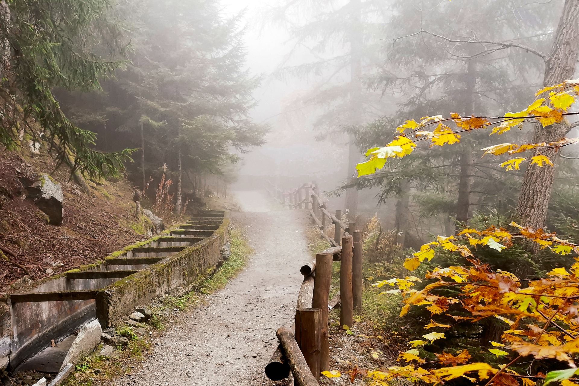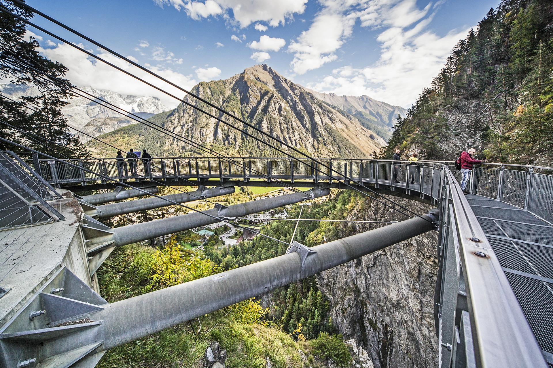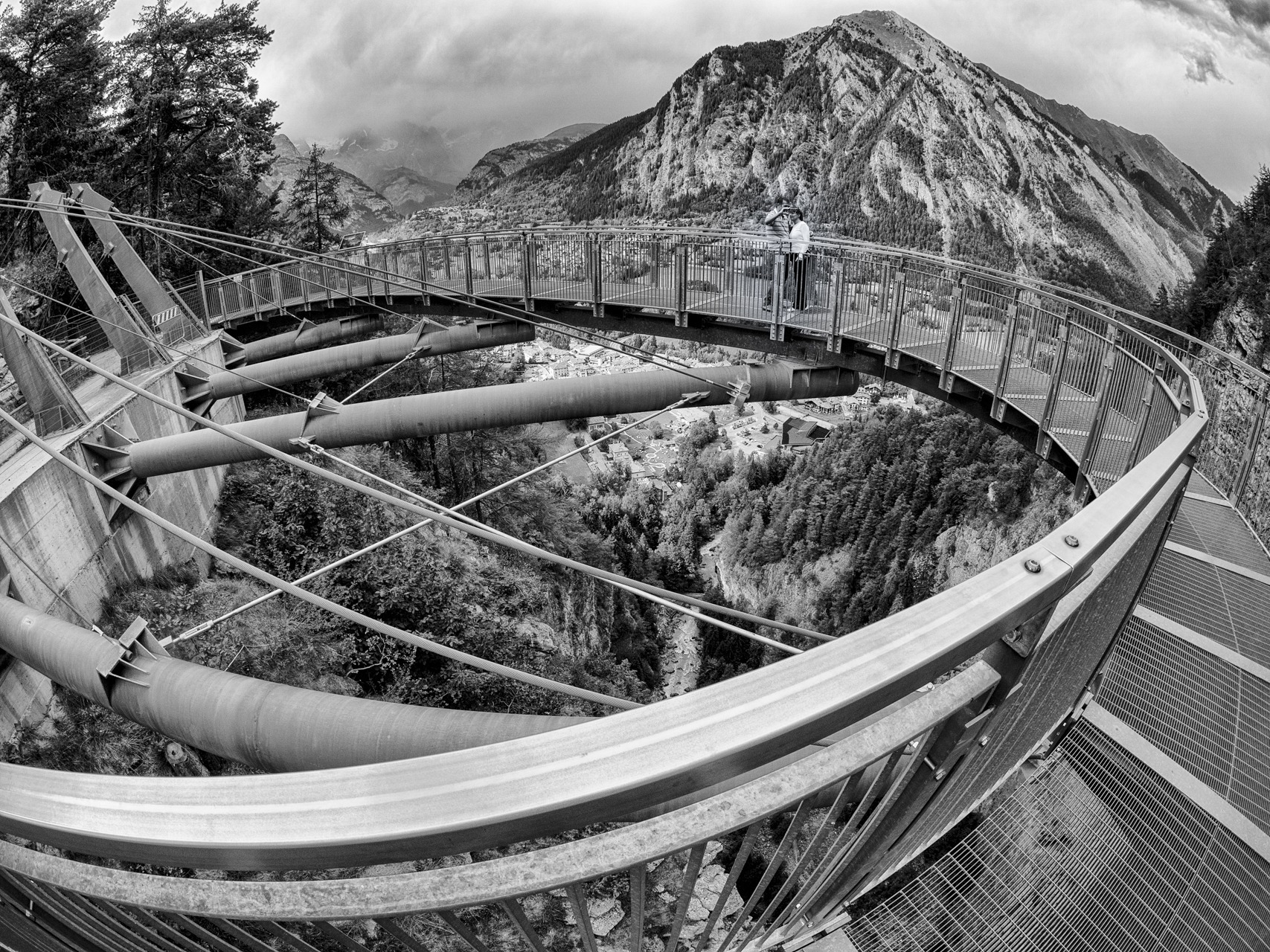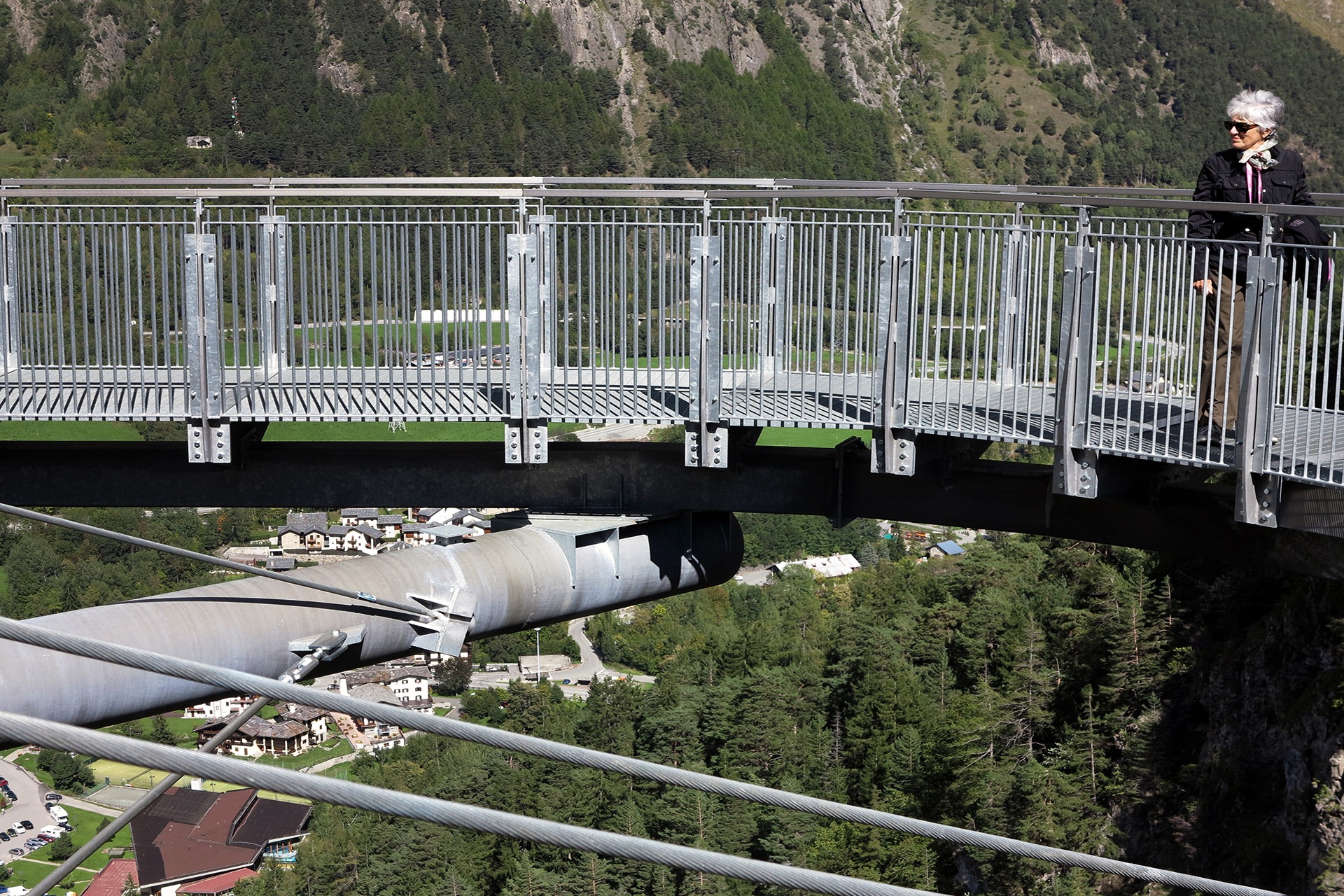 16 - Carta Andrea - 45.765974 N, 6.980951 E. La passerella sospesa sovrastata dalle nubi sembra un essere alieno surreale. Il pannello e la parete rocciosa sul versante opposto, al di fuori delle nubi, danno profondità di campo e riportano l’intera struttura alla realtà