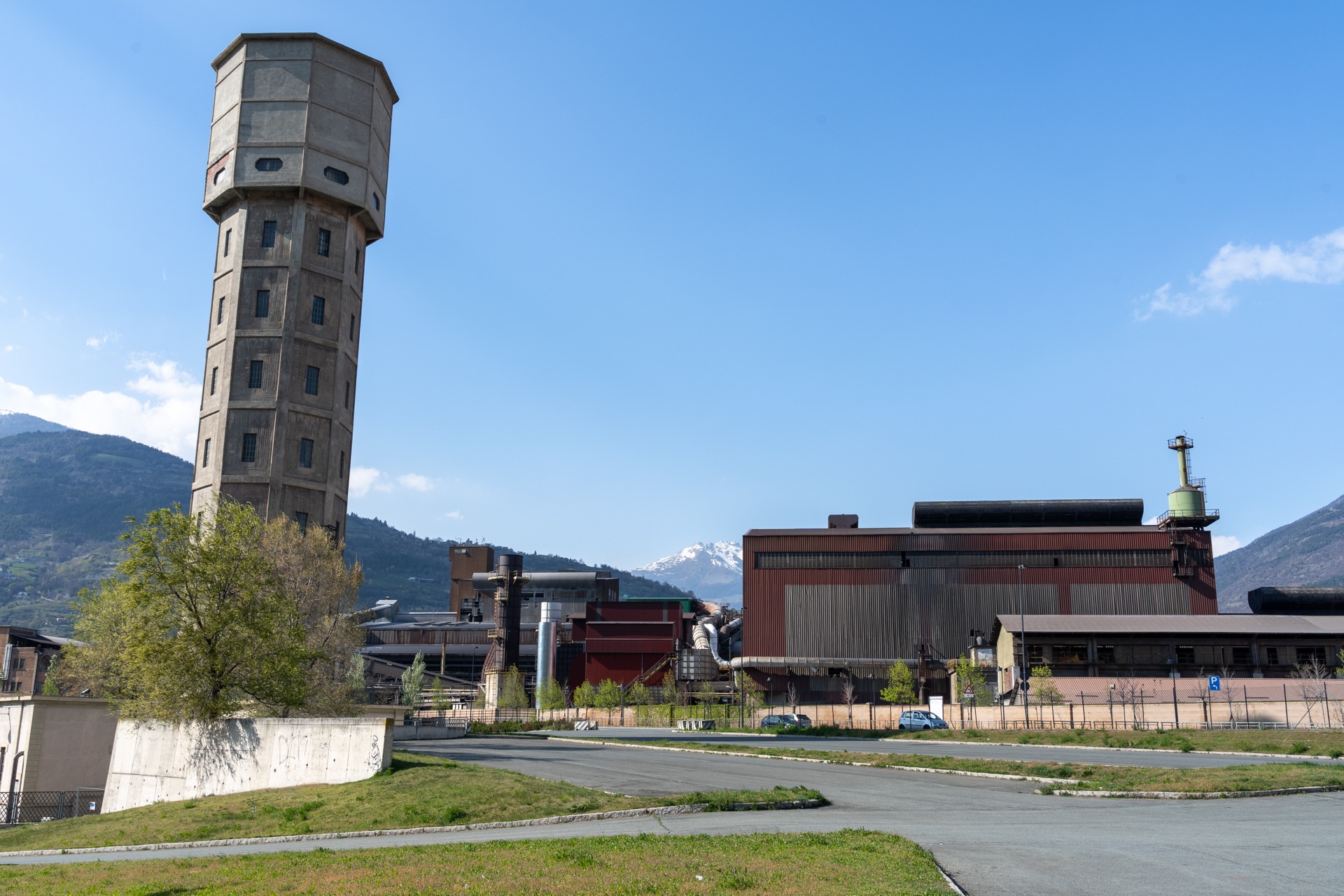 30 - Sasdelli Luigi - Aosta-Saumont: da destra, la vecchia centrale, dismessa e restaurata, con il canale sopraelevato di alimentazione; il viadotto che collega l'autostrada a Via G. San bernardo, il nuovo tratto di strada per il Poligono.