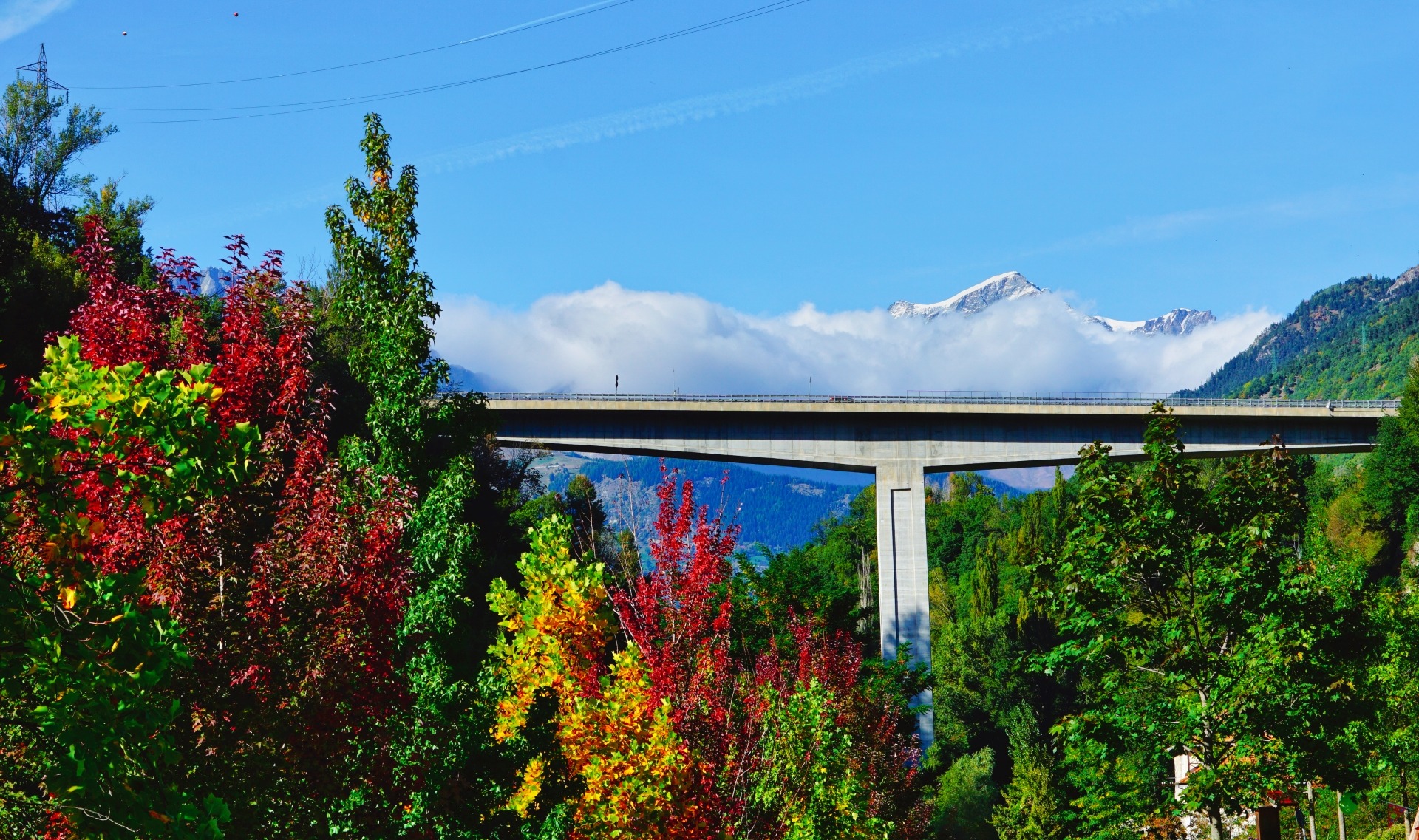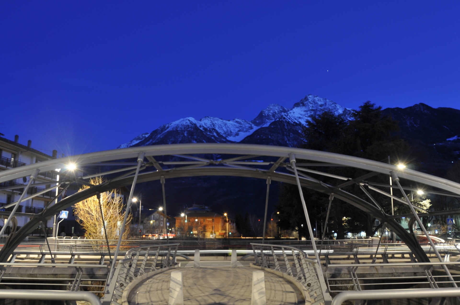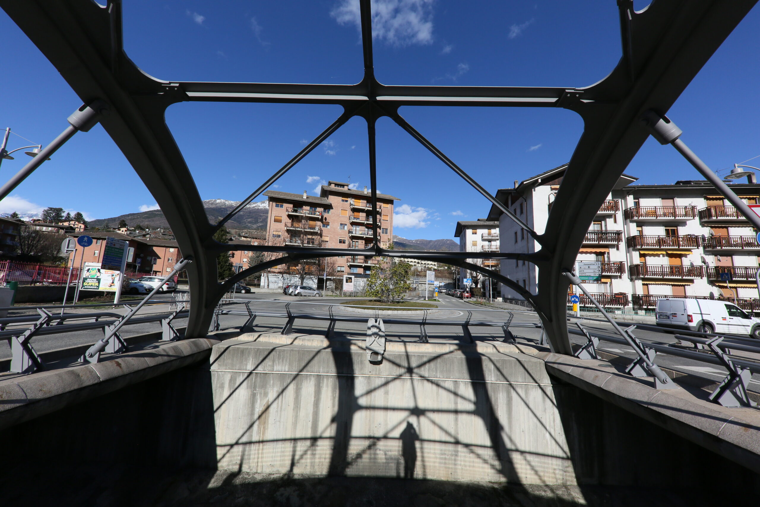 51 - Junod Rosella - La becca di Nona, il Monte Emilius e la Becca Seneva osservano compiacenti l'innovazione e l'Ingegno Umano. Il ponte sul Buthier ad Aosta