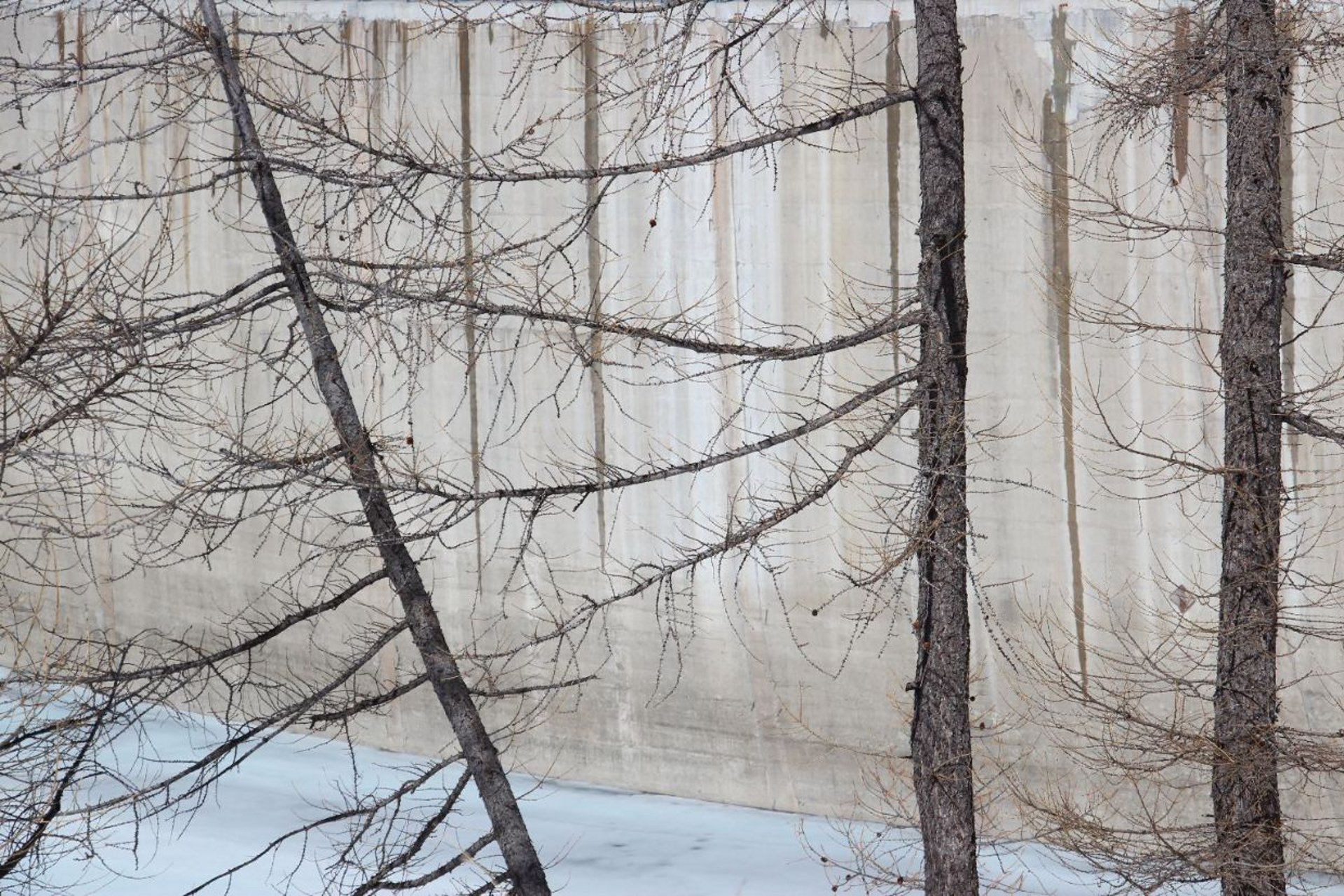 13 - Carta Andrea - 45.765974 N, 6.980951 E. La foto richiama l'apertura di una finestra su un paesaggio invernale. Le linee orizzontali e oblique si intrecciano con armonia. Lo sfondo con gli alberi ritti sulla roccia da forza al contesto ambientale